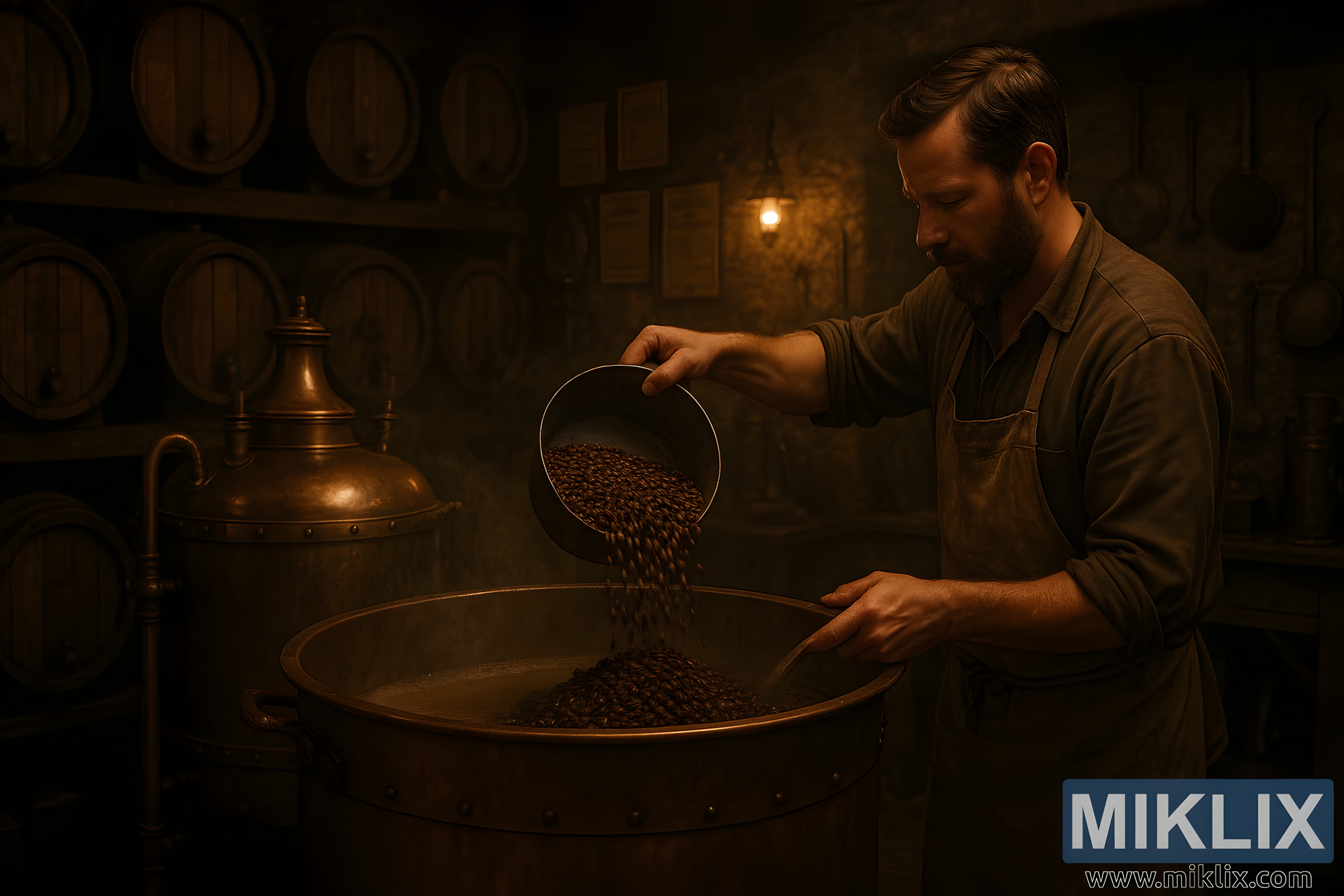 Pivovara boje sepije s bačvama i bakrenim kotlovima dok pivar ulijeva prženi ječam u kazan za slađenje, evocirajući tradiciju, povijest i bezvremenski pivarski zanat.