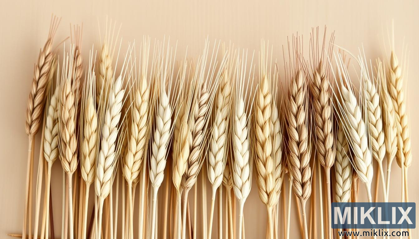 Visokokvalitetni krupni plan različitih vrsta pšenice, s naglaskom na teksture, boje i oblike u čistoj, uravnoteženoj kompoziciji.