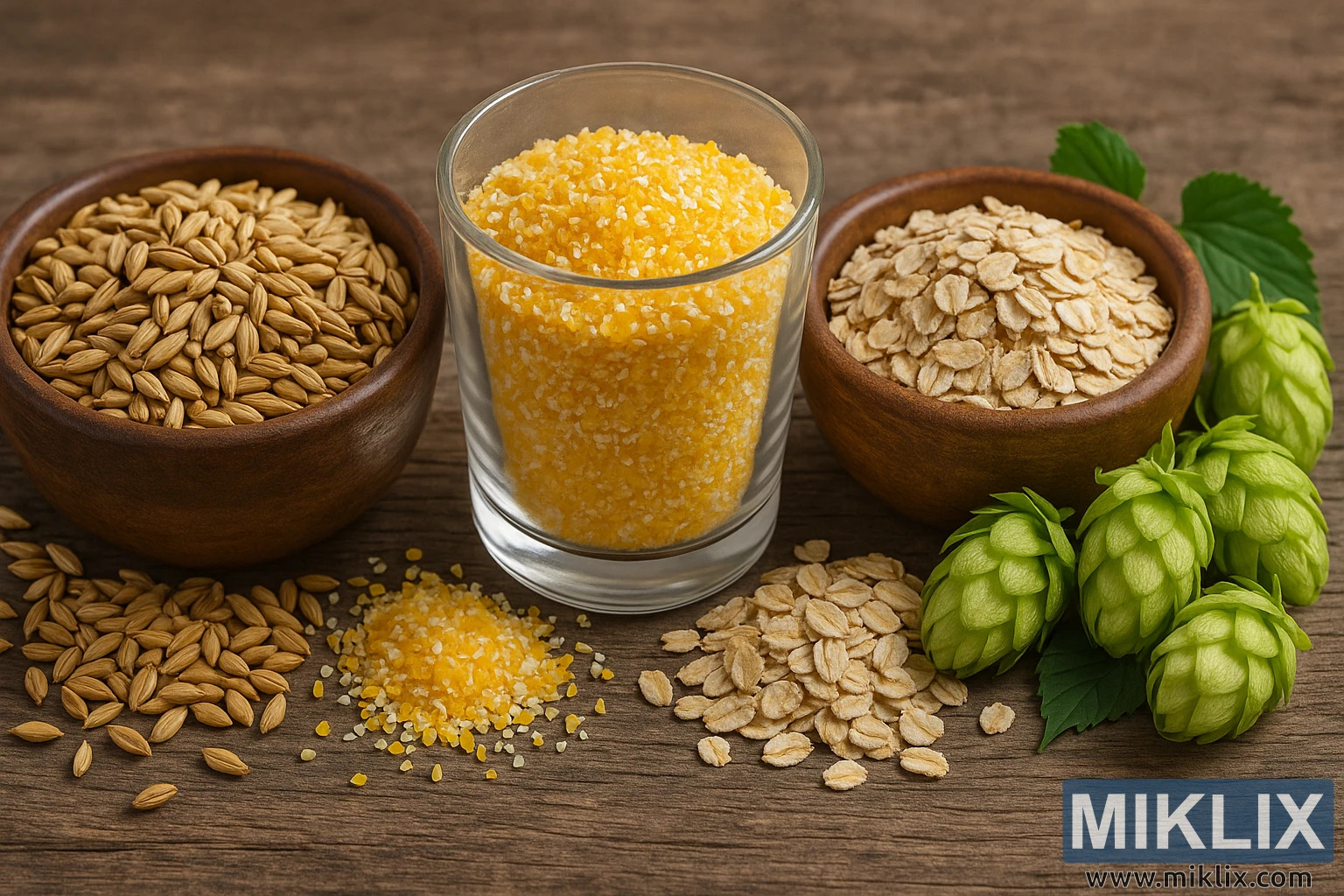 Krupni plan visoke rezolucije ječma, kukuruzne krupice, zobi i svježeg hmelja na rustikalnom drvu, toplo osvijetljen kako bi se istaknule prirodne teksture i sastojci za pivarstvo.