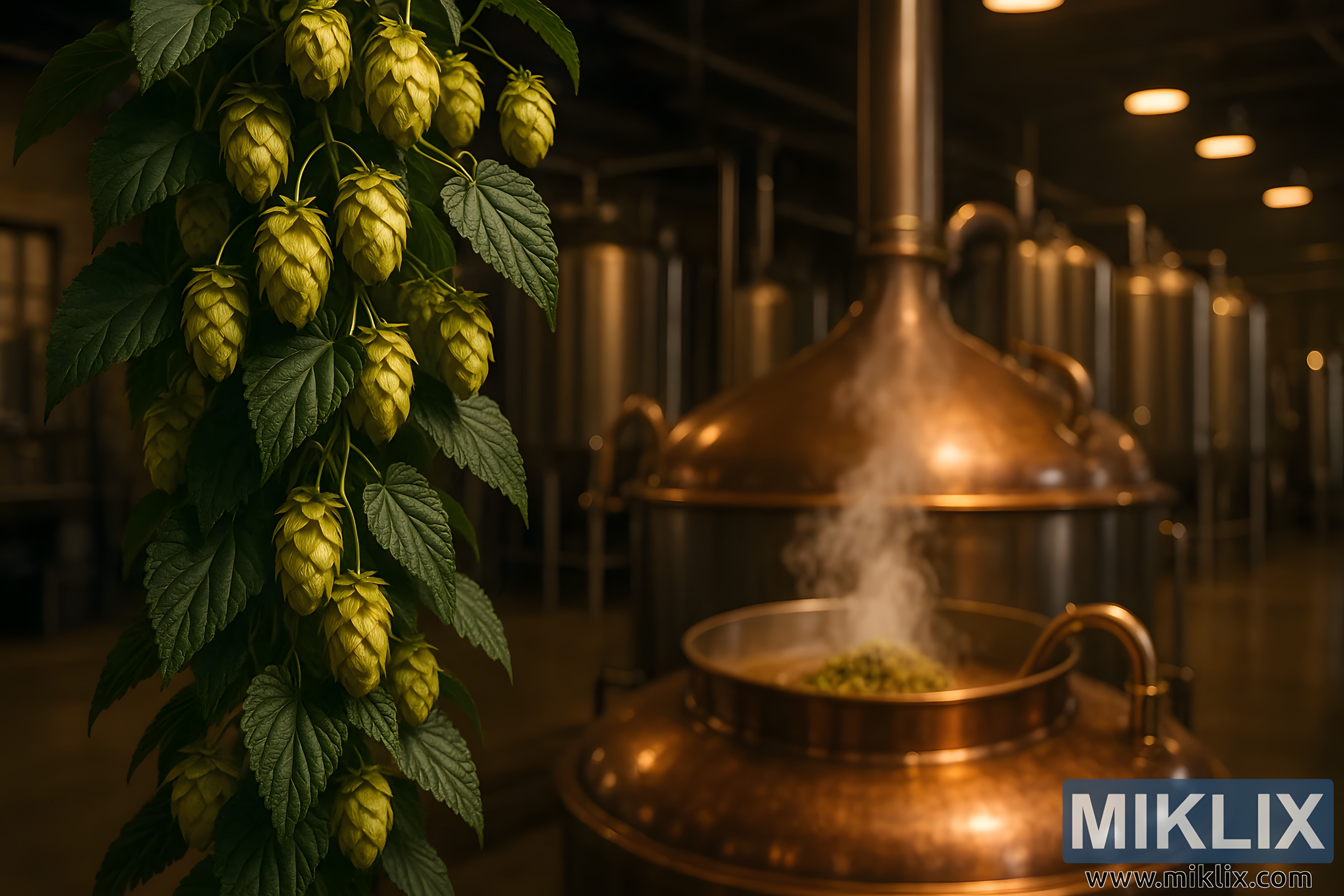 Hmelj African Queen slijeva se pored bakrenog kotla za kuhanje u modernoj pivovari s tankovima od nehrđajućeg čelika, tradicijom miješanja i naprednim pivarskim umijećem.
