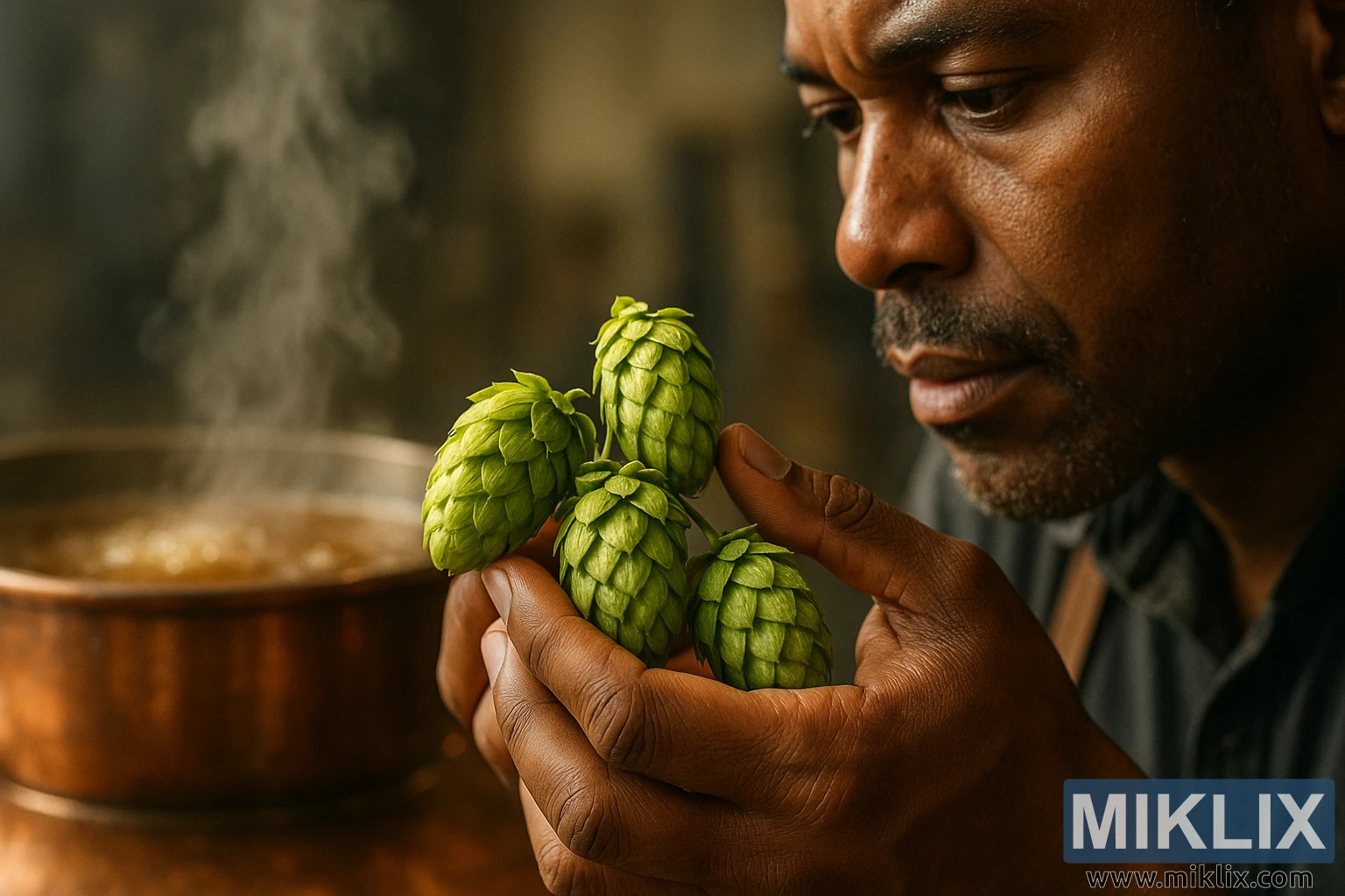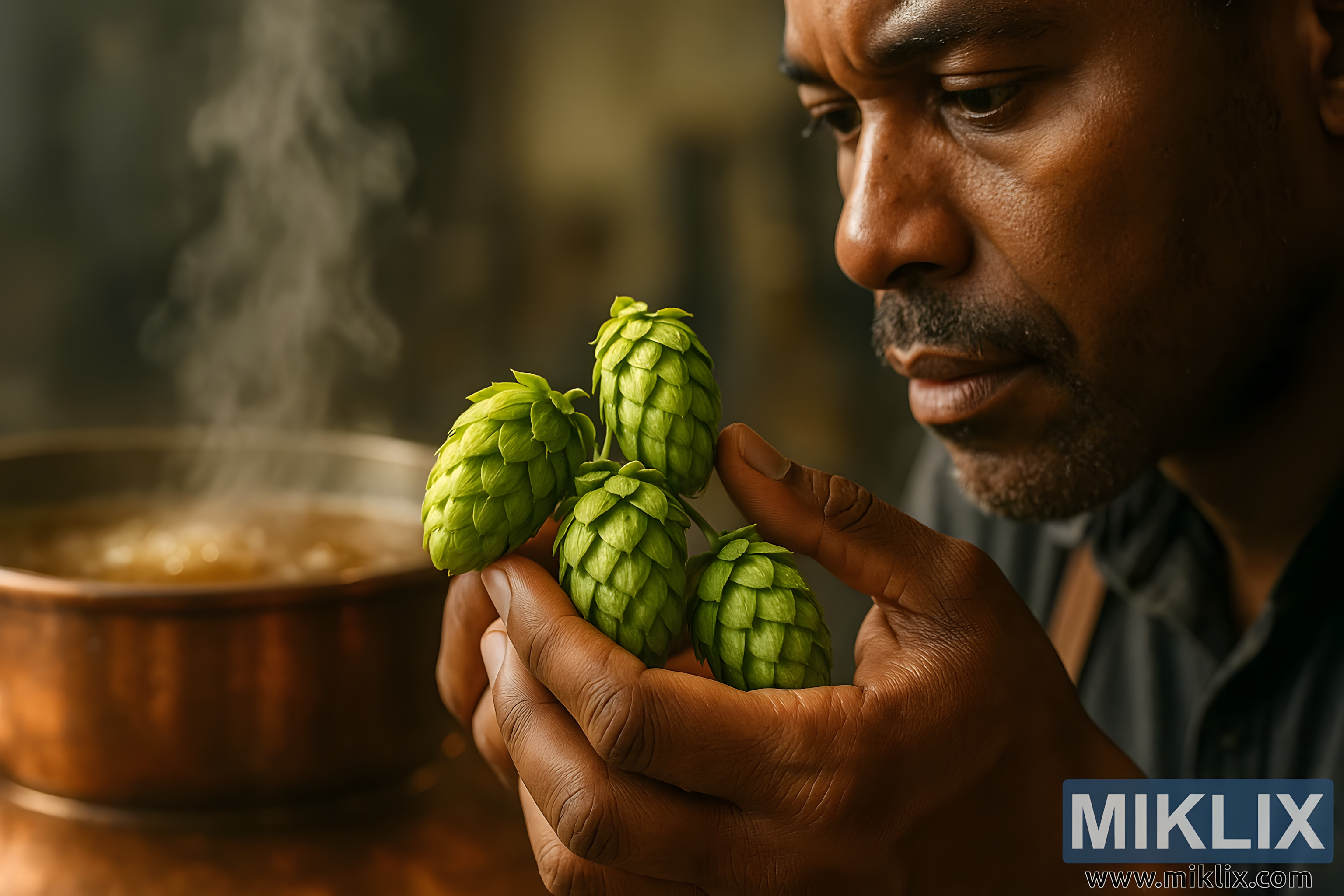 Stručni pivar pregledava hmelj African Queen pored vrućeg bakrenog lonca za kuhanje, s toplim svjetlom koje ističe njihove lupulinske detalje i vještinu kuhanja.