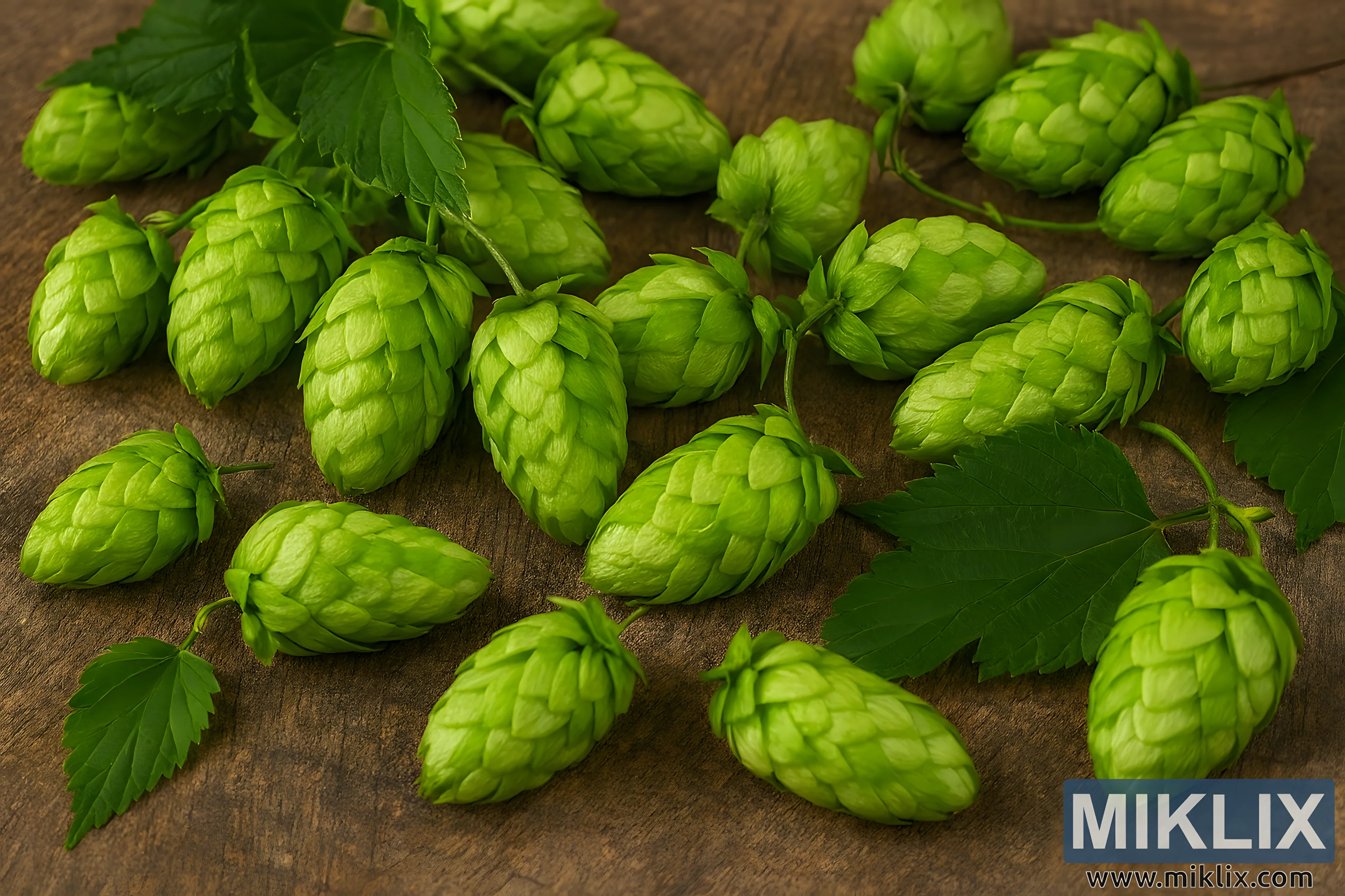 Slika visoke rezolucije svježe ubranih češera hmelja Amarillo raspoređenih na rustikalnoj drvenoj površini s mekim osvjetljenjem