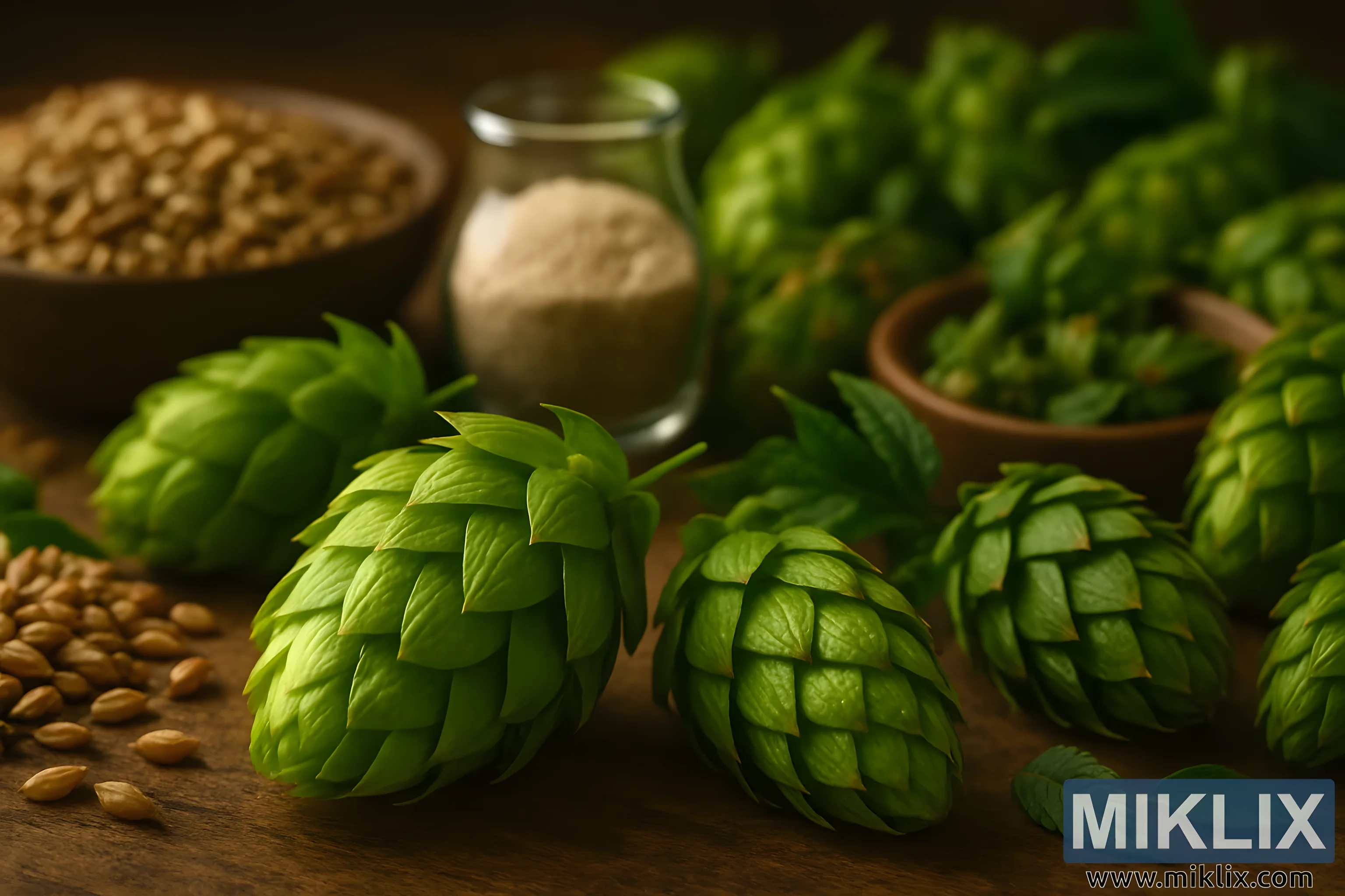 Fotografija uranja gledatelja u intimni svijet sastojaka za kuhanje piva, scenu koja se čini istovremeno pažljivo aranžiranom i bez napora organskom. U prvom planu kompozicije leži nekoliko svježe ubranih češera hmelja Apollo, njihovi puni, gusto slojeviti brakteji razvijaju se poput vlastite umjetnosti prirode. Njihova živahna zelena nijansa dominira prednjim planom, češeri se slabo sjaje pod mekim, zlatnim osvjetljenjem koje naglašava njihovu strukturu i nježne teksture. Svaka ljuska češera djeluje živo s mogućnošću, šapućući o smolastim lupulinskim žlijezdama skrivenim unutra - zlatnim džepovima ulja i kiselina koji imaju moć oblikovanja gorčine, arome i okusa u gotovom pivu. Njihova prisutnost u tako oštrim detaljima odmah ih postavlja kao zvijezde slike, slavlje i njihovog vizualnog i pivarskog značaja.