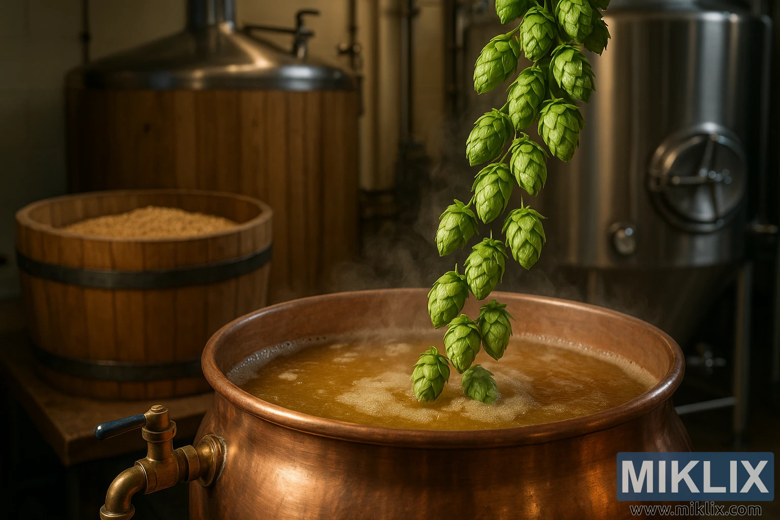 Stogodišnji hmelj slijeva se u bakreni kotao za kuhanje zlatne sladovine, s kadom za slađenje i tankovima od nehrđajućeg čelika iza njega, što naglašava zanatsko pivarstvo.