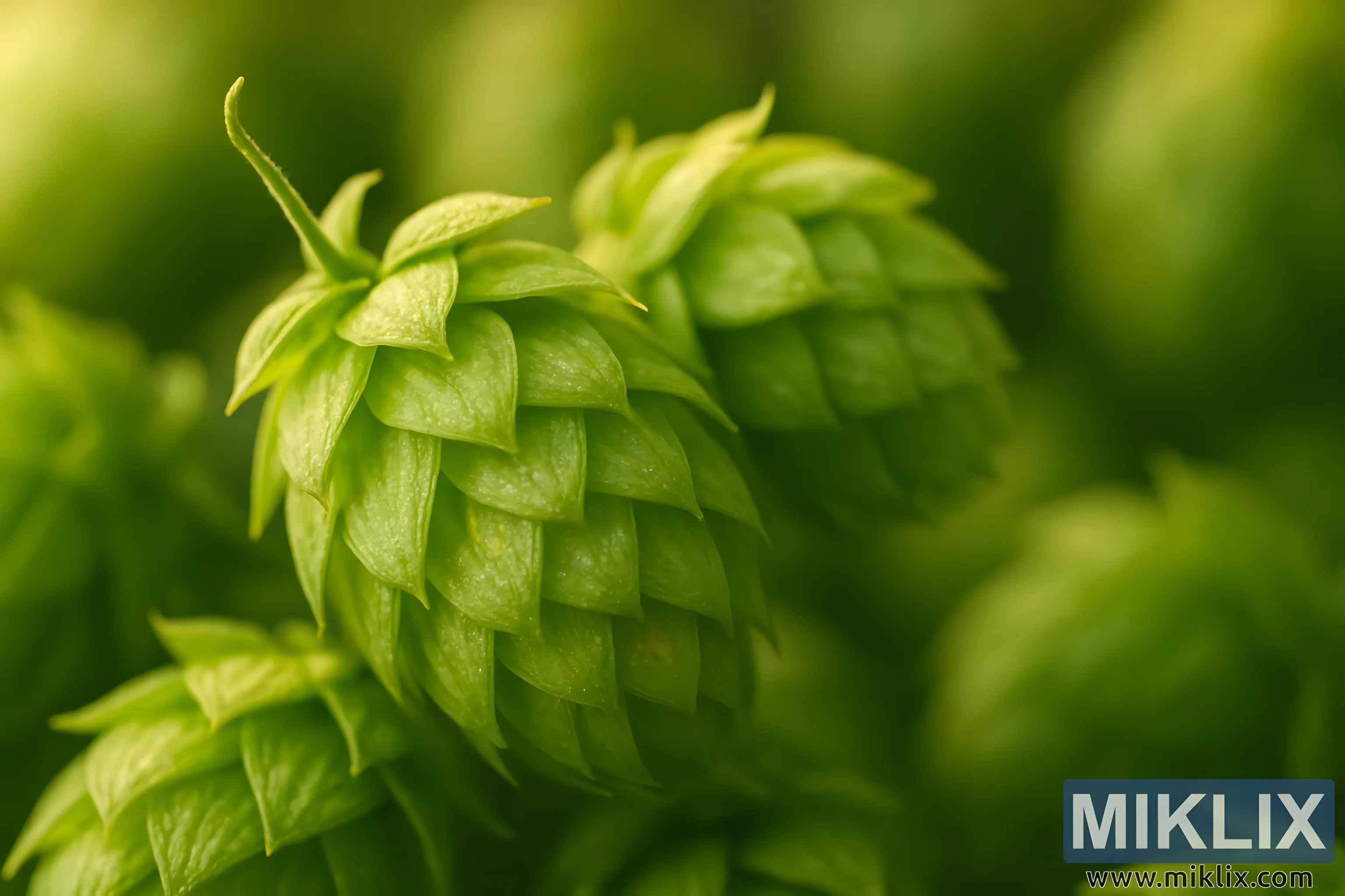 Mala dubinska oštrina izoštrava konus u središtu kadra, omogućujući da se svaki suptilni rub istakne u oštrom reljefu, dok se pozadina rastvara u meku zelenu mrlju. Ova vizualna izolacija čini da se subjekt osjeća neposrednim i živim, kao da gledatelj može pružiti ruku i prstima prijeći preko krhkih latica hmelja. Zamućena pozadina, sastavljena od drugih češera u različitim fazama fokusa, stvara osjećaj obilja i plodnosti, evocirajući ideju cvjetajućeg hmeljara tijekom vrhunca berbe. Ravnoteža fokusa i zamućenja pruža slikarsku kvalitetu, sugerirajući ne samo znanstvenu studiju biljke, već i umjetničku proslavu njezinog oblika i funkcije.