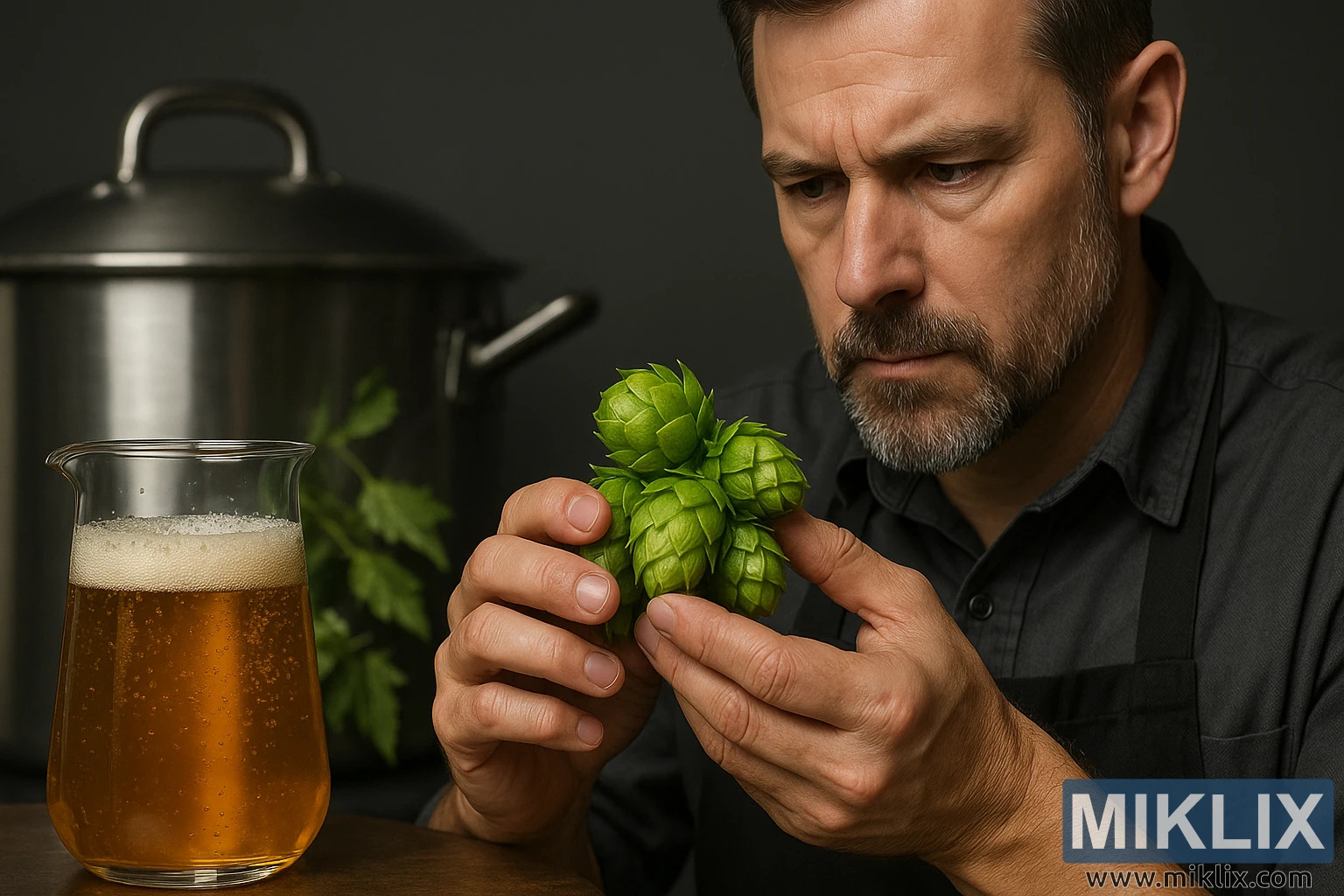 Raspoloženje scene je kontemplativno i precizno. Namršteno čelo pivara i čvrst stisak hmelja sugeriraju da ovo nije ležeran pogled, već ozbiljna procjena, možda mjerenje težine, suhoće ili sadržaja lupulina u češu. Njegove ruke, snažne, ali pažljive, naglašavaju dvostruku ulogu pivara kao znanstvenika i umjetnika. Ova mješavina analitičke strogosti i kreativne vizije zrcali se u međuigri tekstura i površina: sjajnom sjaju piva, matiranoj, papirnatoj strukturi hmelja i hladnom, metalnom sjaju kotla. Svaki element govori o ravnoteži, baš kao što hmelj mora uravnotežiti slatkoću slada, a preciznost strast u procesu kuhanja piva.