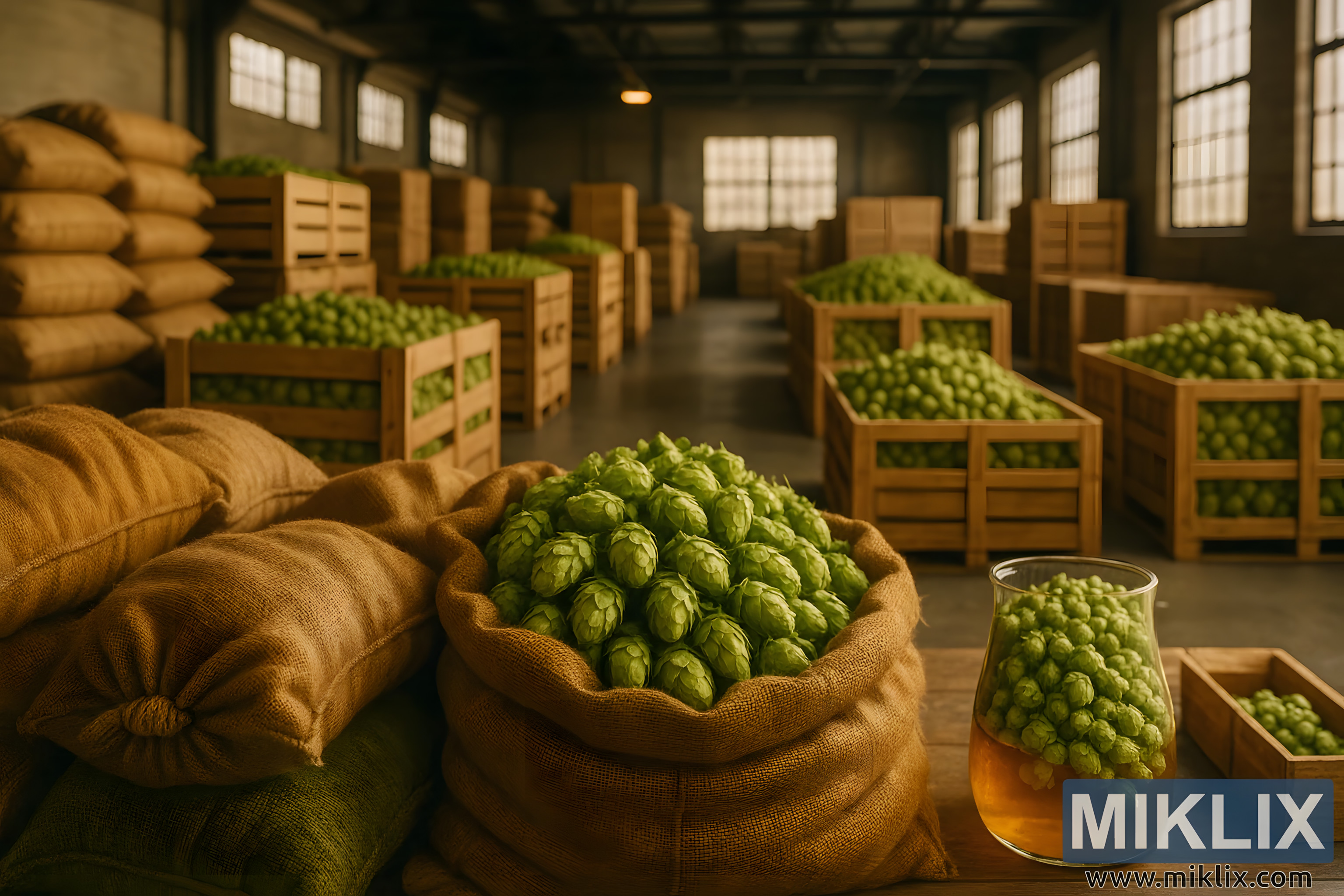 Industrijsko skladištenje hmelja s vrećama od jute i sanducima svježeg kolumbijskog hmelja, s naglaskom na organizaciji, kvaliteti i očuvanju okusa.