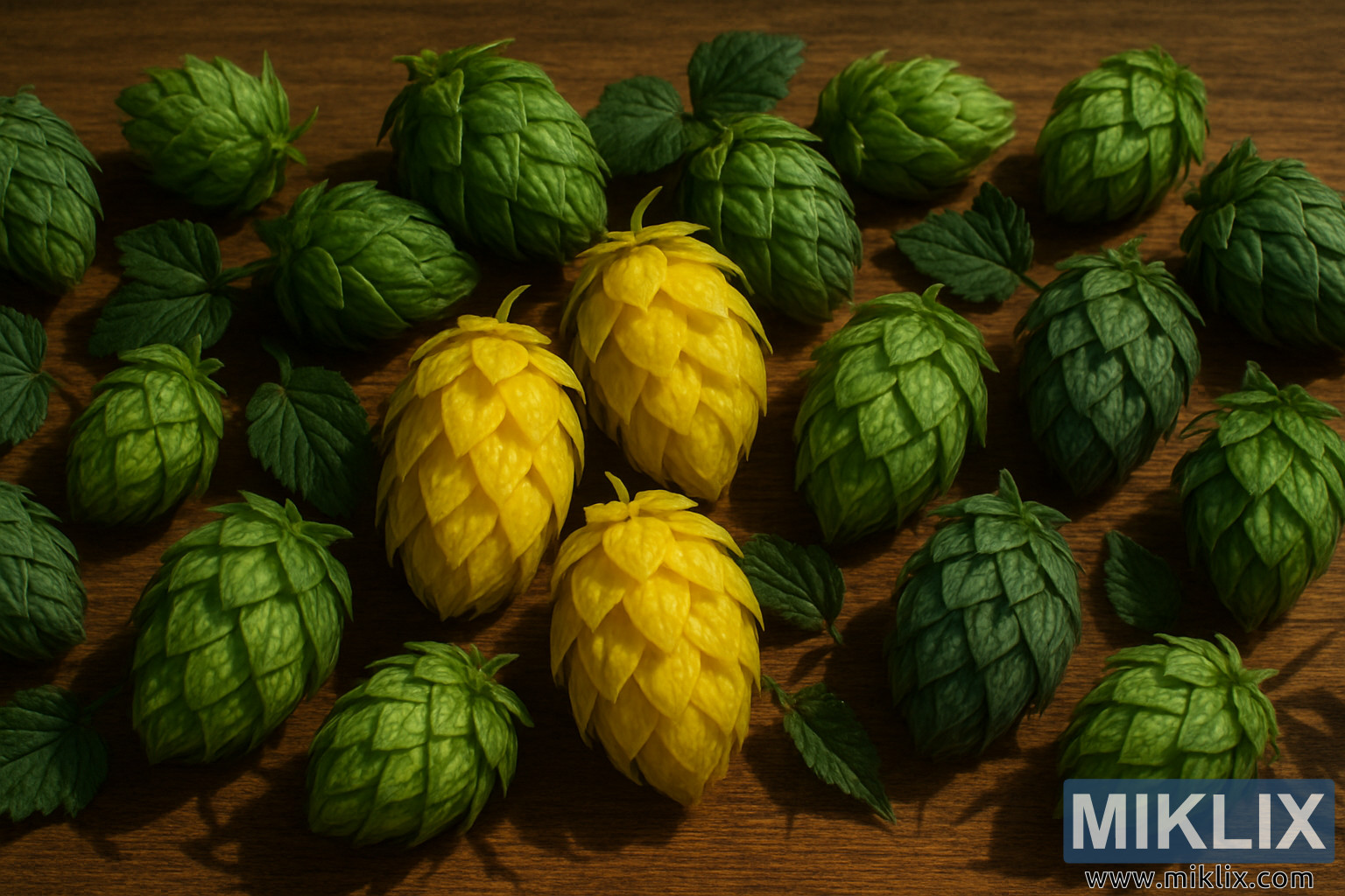 Hmelj El Dorado, Mosaic, Cascade i Amarillo aranžiran na drvu s dramatičnom rasvjetom, ističući njihove teksture i umjetničko umijeće kuhanja.