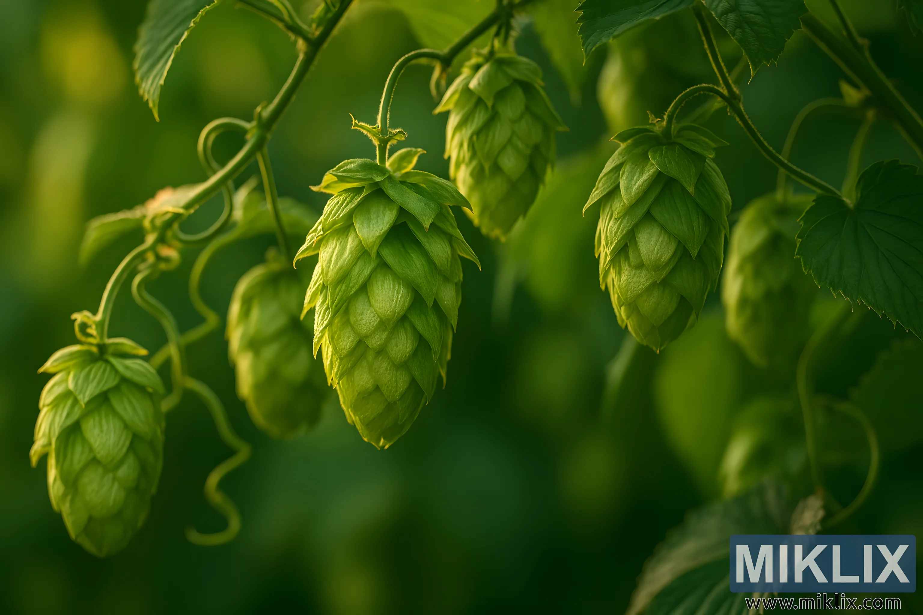 Zlatna sunčeva svjetlost probija se kroz gornji dio krošnje, bacajući tople reflekse i meke sjene preko češera i lišća. Ova rasvjeta ne samo da naglašava zamršene površinske teksture češera hmelja - svaki braktej s finim grebenima i rubovima - već i stvara nježnu međuigru svjetla i tame koja evocira toplinu kasnog poslijepodneva ili rane večeri. Mala dubinska oštrina osigurava da središnji češer hmelja ostane središnja točka, s elementima pozadine nježno zamućenim u bokeh zelenih i jantarnih nijansi.