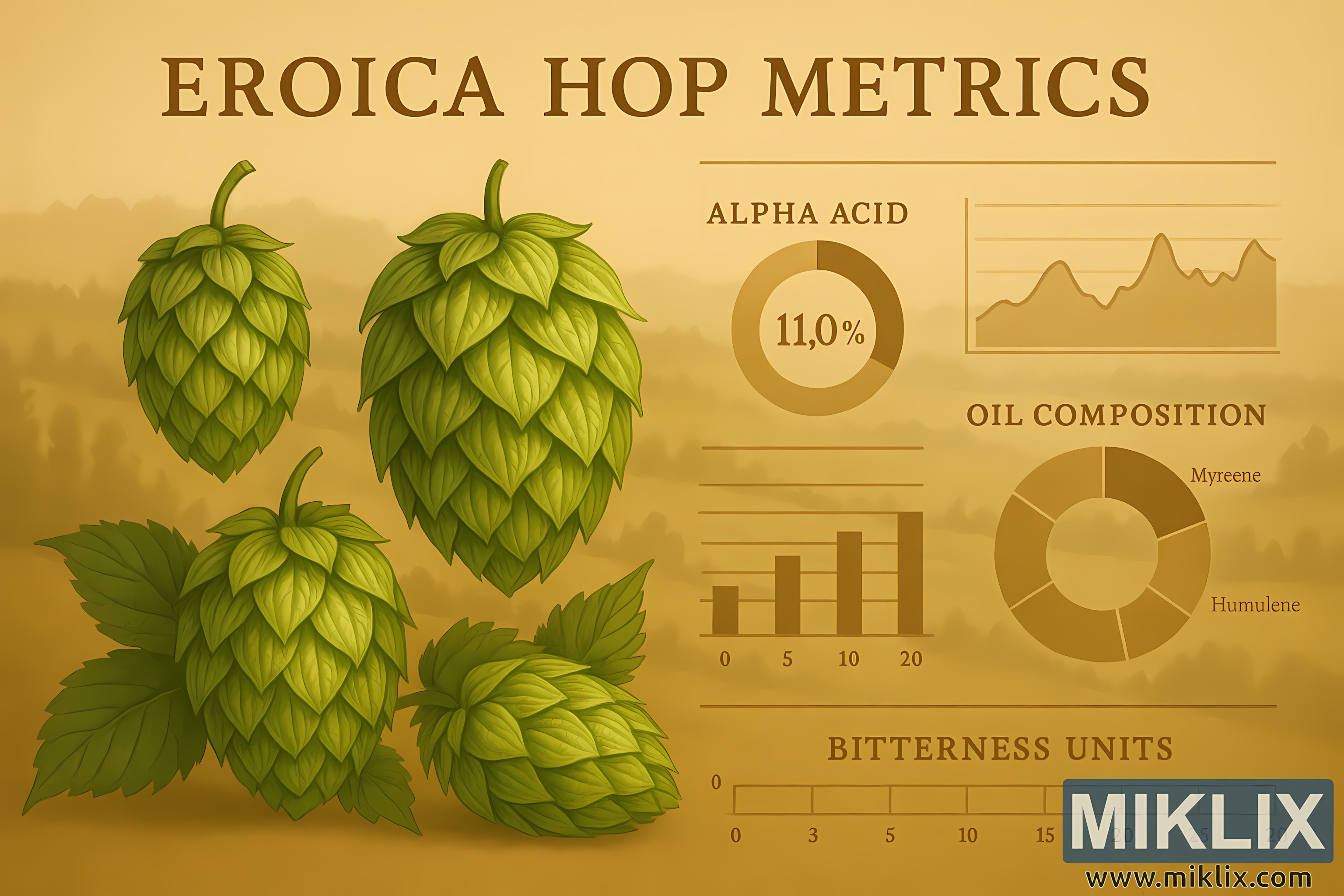 Detaljna digitalna ilustracija češera hmelja Eroica s grafikonima koji prikazuju alfa kiseline, sastav ulja i metrike gorčine na toploj pozadini.