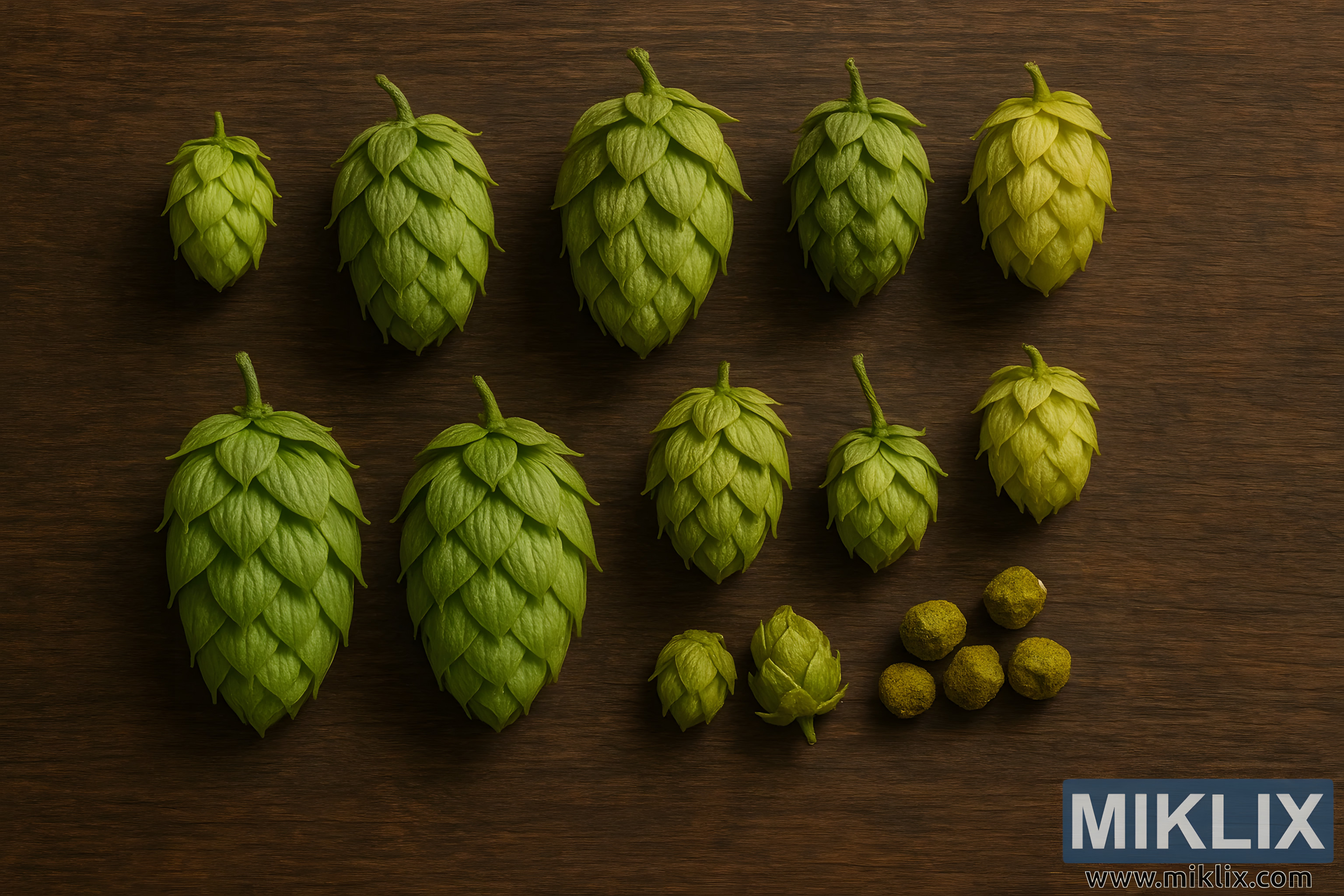 Slika predstavlja upečatljiv i pedantan aranžman mrtve prirode osmišljen kako bi istaknuo raznolikost i nijanse unutar sorti hmelja, s posebnim naglaskom na hmelj Eureka i njihove bliske srodnike. Uredno raspoređeni po bogatoj, rustikalnoj drvenoj površini, češeri su organizirani u namjernim redovima, a svaki od njih pokazuje varijacije u veličini, obliku i boji. Neki su veliki i izduženi, njihovi brakteji čvrsto su složeni u preklapajućim spiralama koje se slabo presijavaju pod toplim, usmjerenim svjetlom. Drugi su manji i kompaktniji, njihove ljuske su nešto labavije, a nijanse im se prebacuju od živahne smaragdne do prigušene žutozelene, što sugerira različite faze zrelosti ili suptilne sortne razlike. Ovaj pažljivi prikaz omogućuje gledatelju da češere ne smatra samo sastojcima, već živim poljoprivrednim proizvodima s jedinstvenim identitetima, od kojih svaki nosi priču od loze do pivovare.