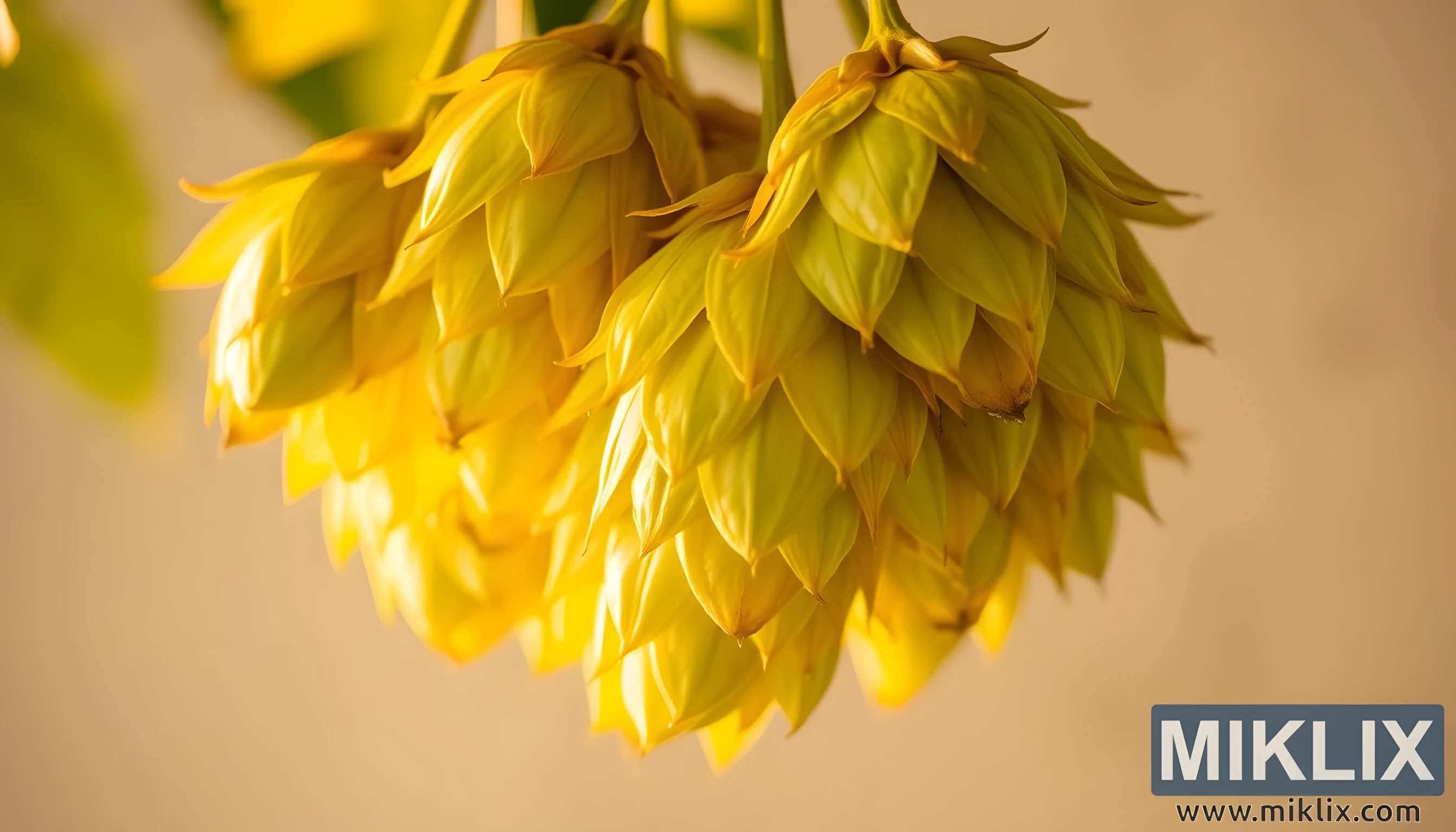 Rasvjeta u kompoziciji je topla i usmjerena, strujeći preko češera na način da naglašava i njihovu mekoću i preciznost. Svijetli dijelovi klize po grebenima papirnatih brakteja, dok se sjene uvlače u nabore, dajući svakom češeru dubinu i dimenzionalnost. Ova međuigra svjetla i sjene ne samo da poboljšava vizualnu teksturu već i taktilnu kvalitetu hmelja, evocirajući osjećaj dodira - gotovo se može zamisliti suha, blago hrapava površina između prstiju ili slaba ljepljivost koju ostavljaju lupulinske žlijezde kada se češeri otvore. Ove žlijezde, skrivene unutar slojevite strukture, spremišta su eteričnih ulja i smola koje definiraju karakter hmelja, sadrže alfa kiseline odgovorne za gorčinu i hlapljive spojeve koji pivu daju cvjetne, citrusne, zemljane ili borove arome.
