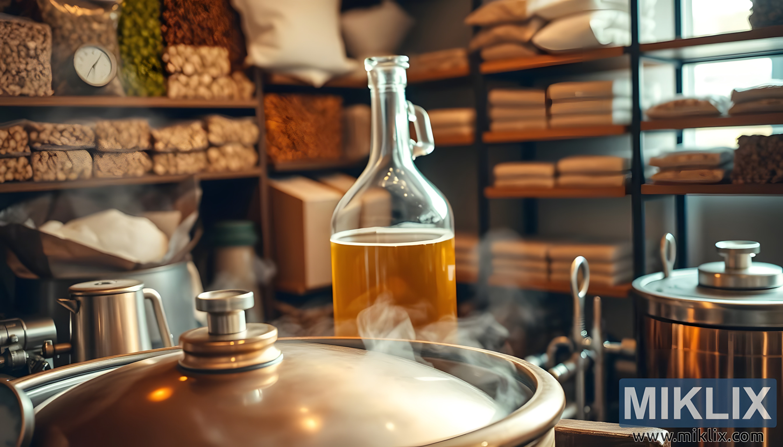 Bakreni kotao za pivo, staklena demižona i pribor za kuhanje piva raspoređeni u toplom, ugodnom okruženju s policama hmelja i slada, prikazujući zanat pivarstva.