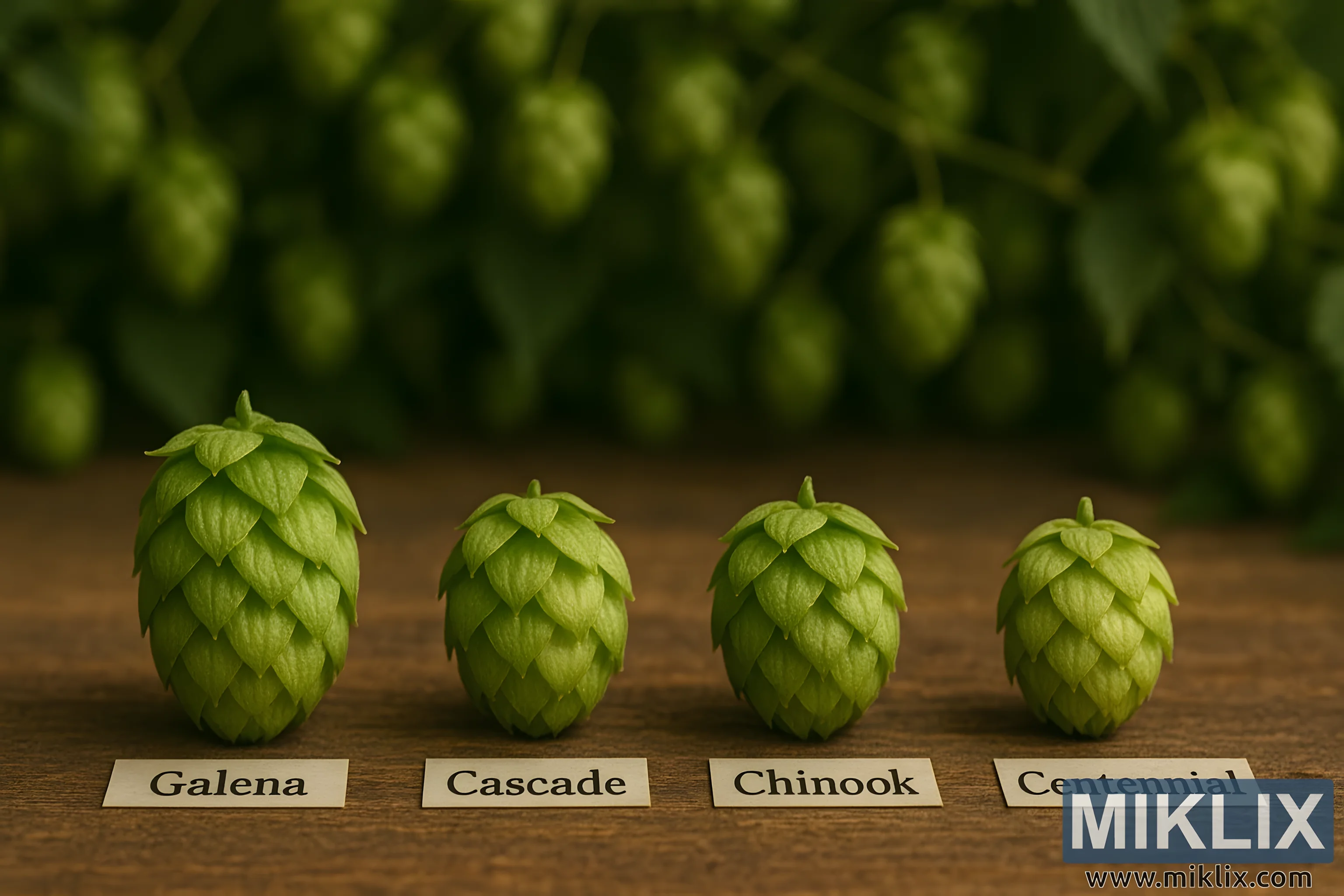 Pažljivo položene na rustikalnu drvenu površinu, četiri češera hmelja stoje poput dragulja svijeta pivarstva, svaki različit po veličini, obliku i suptilnoj teksturi. Topli sjaj prirodnog svjetla nježno se filtrira preko scene, ističući njihove nježne brakteje i žive nijanse zelene koje razlikuju jedan od drugog. U prvom planu nalazi se češer Galena, najveći od četiri, čija izdužena struktura i gusto slojeviti listovi odišu osjećajem gustoće i snage. Desno od njega leži Cascade, kompaktniji, s nešto zaobljenijim oblikom koji kao da nagovještava svijetli citrusni i cvjetni karakter zbog kojeg je toliko voljen. Sljedeći je Chinook, malo robusnijeg izgleda, s braktejama raspoređenim na način koji sugerira smjelost i intenzitet, odražavajući borove i smolaste note koje definiraju njegovu osobnost u pivu. Konačno, Centennial, najmanji od četiri, nalazi se krajnje desno, uredno uravnotežen i simetričan, predstavljajući svestranost i ravnotežu koja ga je učinila temeljem bezbrojnih recepata.