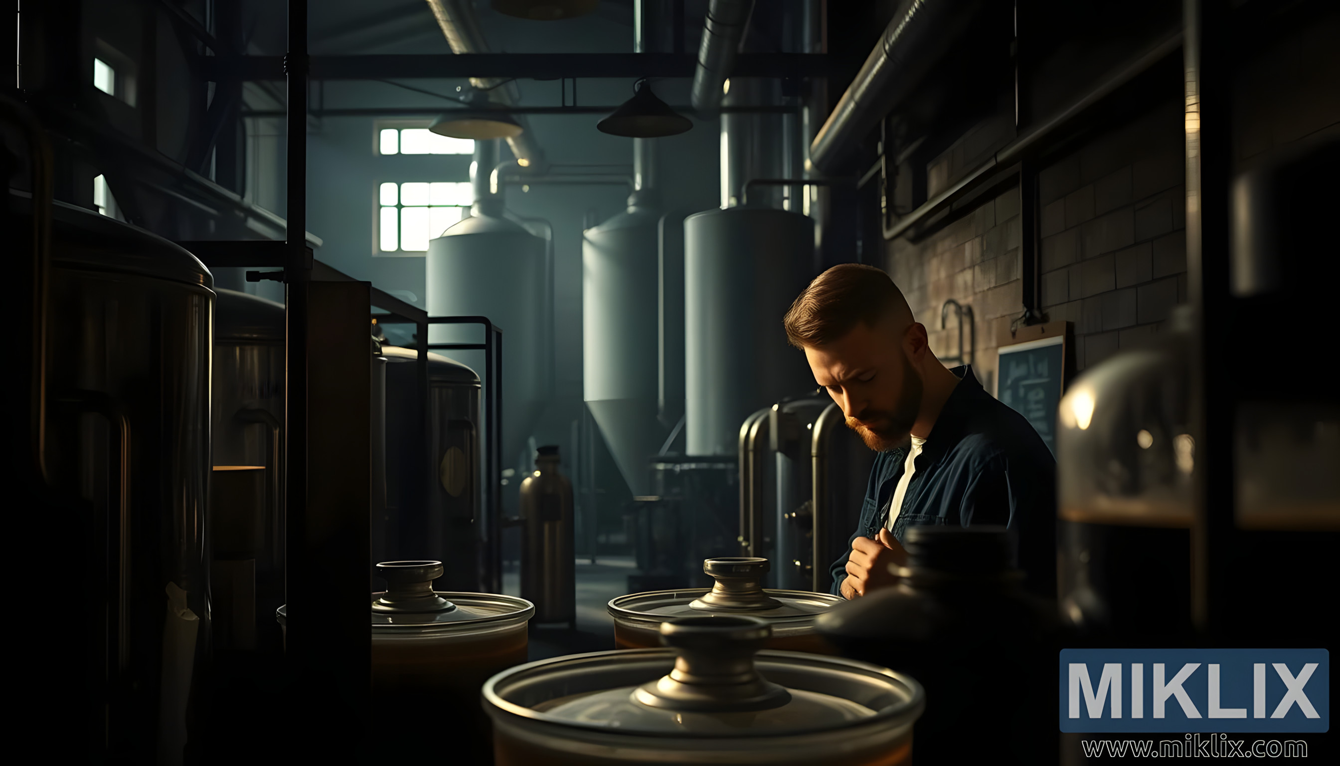 prigušenoj, šupljini unutrašnjosti pivovare, svjetlost se filtrira u teškim, namjernim zrakama, hvatajući se za metalne površine posuda za kuhanje i bacajući oštre sjene koje se protežu po podu. Atmosfera je gusta od pare i slabog okusa slada, zrak je živ od mirisa šećera koji se razgrađuju i kvasca koji ih postupno pretvara u alkohol. U prvom planu, niz napola napunjenih fermentacijskih tankova prigušeno svjetluca u slabom svjetlu, njihovi poklopci odražavaju slabe valove osvjetljenja. Svaka posuda djeluje gotovo živo, suptilno klokotanje ventila za ispuštanje CO₂ prekida tišinu tihim podsjetnicima na tekući proces fermentacije. Zbrka cijevi, ventila i mjerača koji se križaju po sceni doprinosi osjećaju složenosti, vizualnom podsjetniku da je kuhanje piva jednako o snalaženju u izazovima koliko i o umjetnosti.