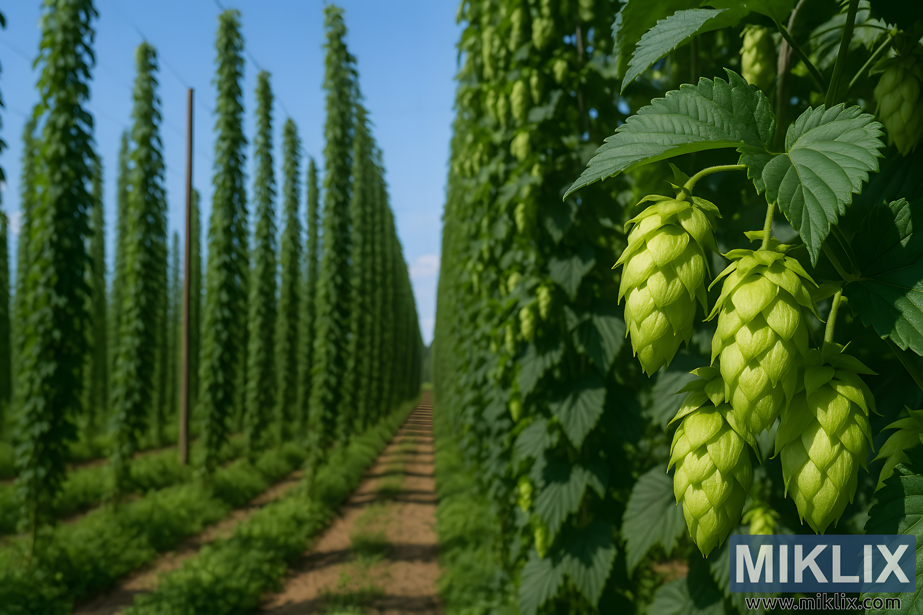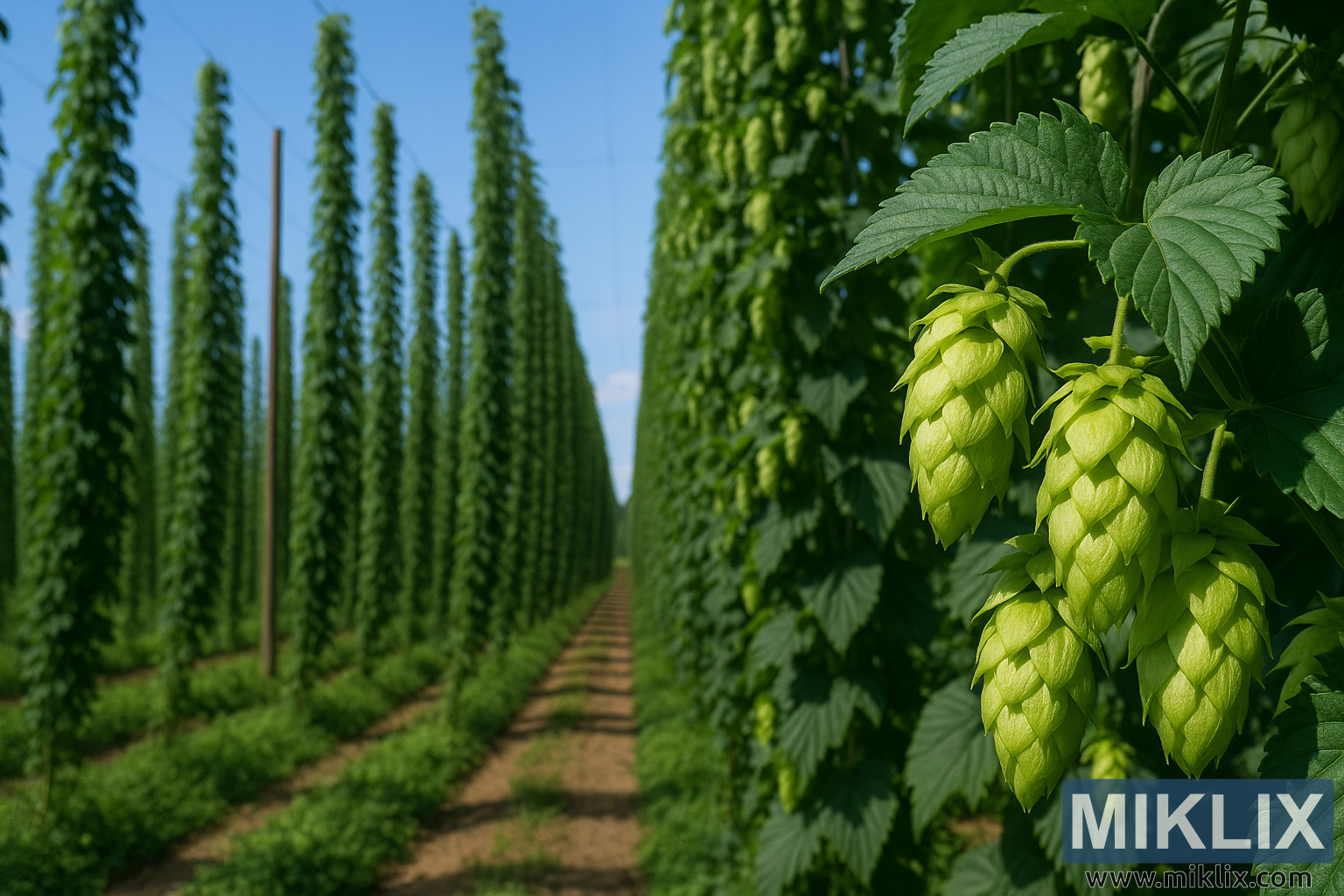 Na ovoj krajobraznoj slici visoke rezolucije, bujno polje hmelja proteže se prema horizontu ispod vedrog plavog ljetnog neba. Prizorom dominiraju visoke, pomno raspoređene rešetke koje podupiru guste okomite zidove hmelja, pri čemu se svaka loza penje prema gore s snažnim zelenim rastom. Redovi rešetki tvore snažne paralelne linije koje vode oko duboko u daljinu, stvarajući osjećaj razmjera, strukture i urednog ritma poljoprivrednog dizajna. Između ovih visokih redova leži uski zemljani put, lagano utaban i omeđen nižim raslinjem, što dodaje dubinu i perspektivu, a istovremeno naglašava samu visinu biljaka.