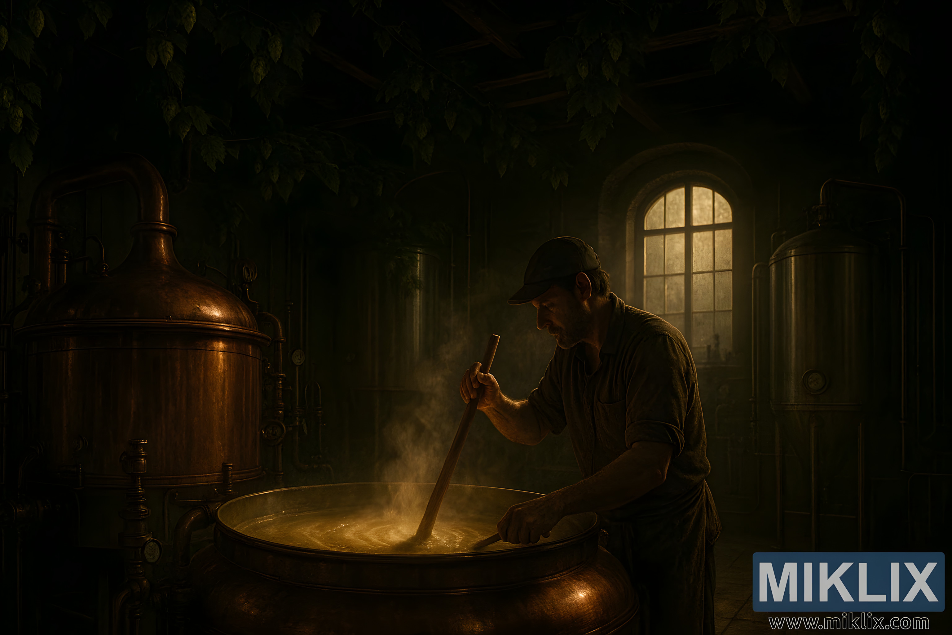 prvom planu, pivar stoji nad otvorenim kotlom za kuhanje piva, njegov stav odiše tihom koncentracijom i strpljenjem. Muškarac, odjeven u pohabanu odjeću i kapu, miješa kipuću sladovinu dugom drvenom lopaticom, pokretom stabilnim i svrhovitim, rođenim iz vježbe i instinkta. Pramenovi pare uvijaju se s površine, hvatajući svjetlost u užarenim viticama koje se uzdižu prema rogovima. Zrak je vidljivo ispunjen toplinom i mirisom - zemljanim, cvjetnim i suptilno začinjenim notama hmelja Horizon, svježe dodanim kipućoj sladovini, miješajući se sa slatkom zrnatošću slada. Pivarovo lice, djelomično osvijetljeno sjajem prozora, nosi izraz usredotočenosti, odražavajući ozbiljnost s kojom pristupa ovoj delikatnoj transformaciji. Čini se da svaki pokret utjelovljuje umjetnost kuhanja piva: ravnotežu znanosti i intuicije, tradicije i inovacije, strpljenja i preciznosti.