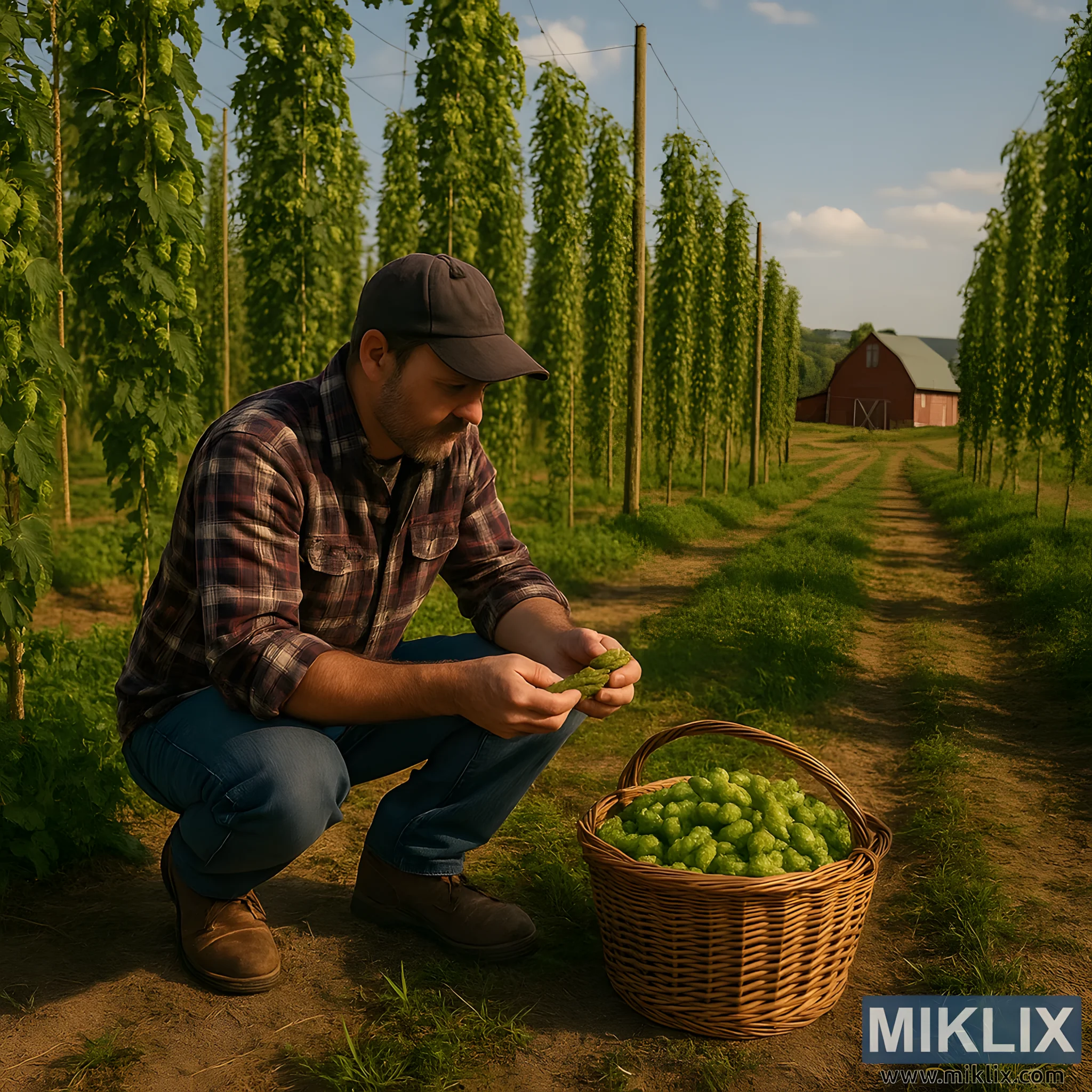 Sunčana farma hmelja s rešetkastim štalama, crvenom štalom i poljoprivrednikom koji pregledava hmelj pored košare za žetvu, pokazujući obilje i stručnost uzgajivača.