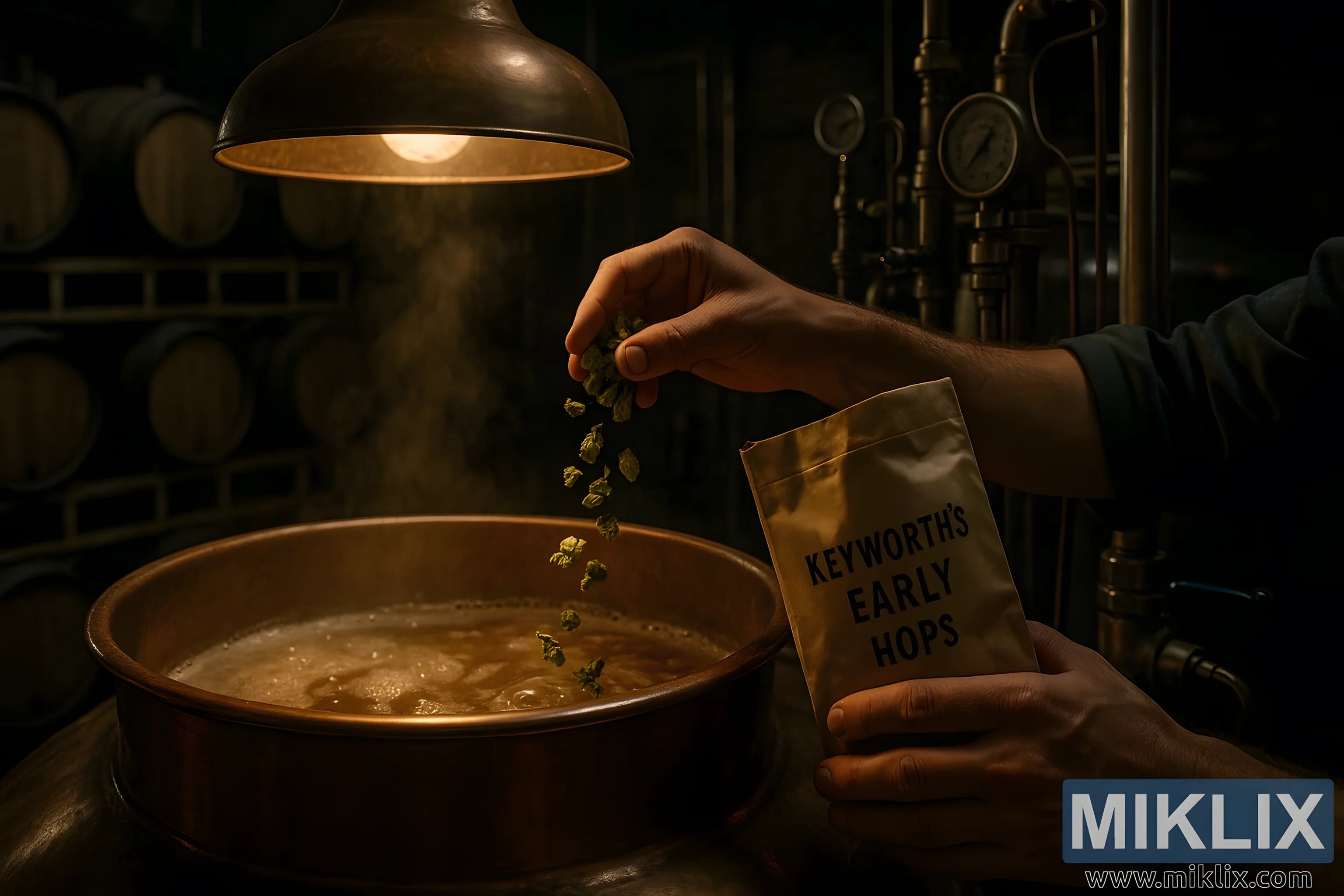 prvom planu su vješte ruke pivara, uhvaćene usred pokreta dok ispuštaju odmjerenu kaskadu hmeljskih peleta u kipuću sladovinu ispod. Ruka lebdi precizno, ne užurbano već promišljeno, hvatajući ravnotežu između tehničkog majstorstva i umjetničkog instinkta. U drugoj ruci počiva skromna papirnata vrećica s oznakom Keyworth's Early Hops, tipografija smjela i neukrašena, podsjetnik na jednostavnu autentičnost sirovih sastojaka. Kontrast između skromnog pakiranja i transformativnog potencijala sadržaja naglašava središnju istinu kuhanja piva: izvanredni okusi mogu se pojaviti iz najskromnijih početaka. Dok hmelj pada, graciozno se vije kroz topli zrak, a svaka zelena mrlja simbol je gorčine, arome i slojevite složenosti koju će na kraju dati gotovom pivu.