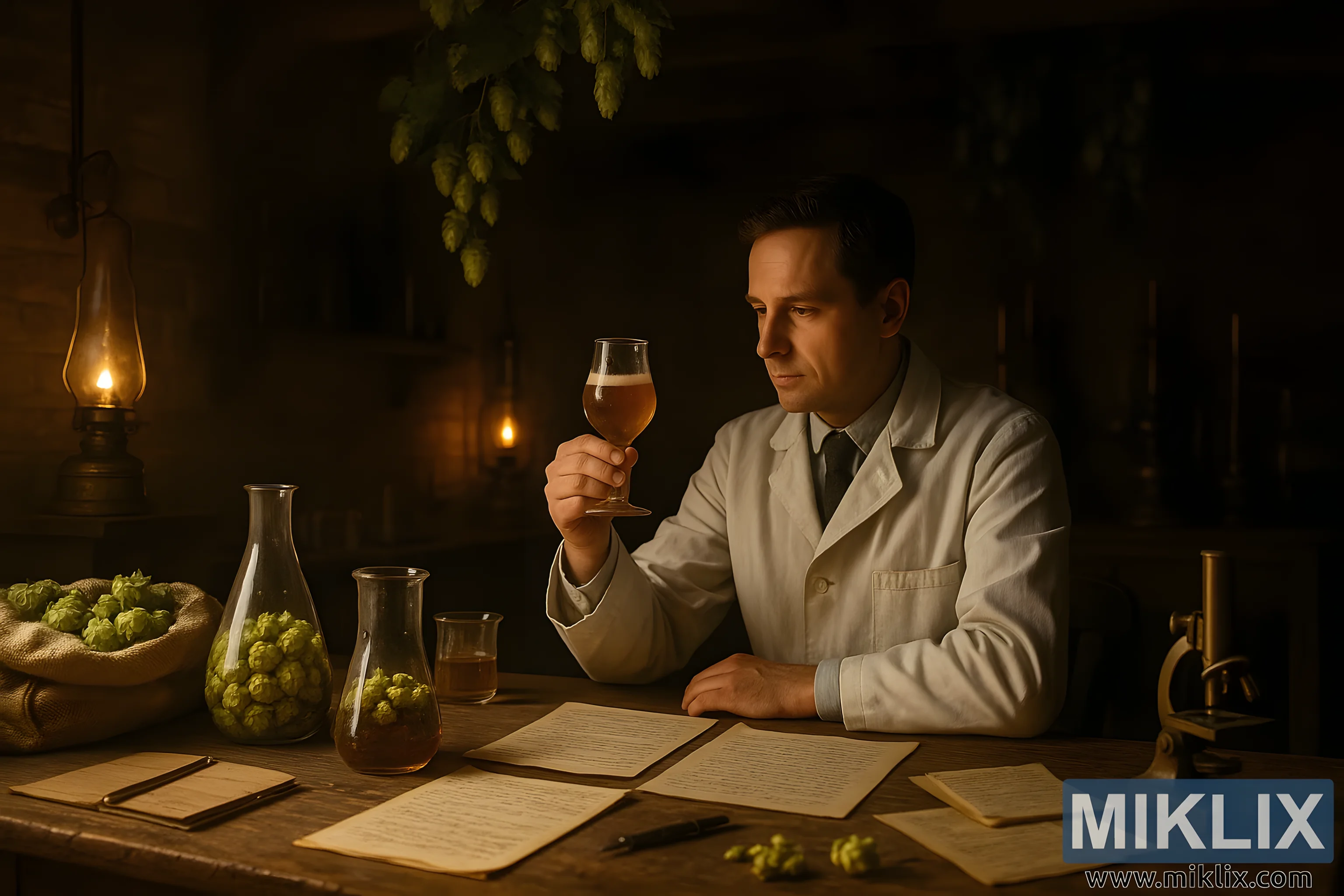 Slabo osvijetljeni laboratorij pivovare iz 19. stoljeća s hmeljem, čašama i istraživačem koji proučava Keyworthov rani hmelj u toplom svjetlu lampe.