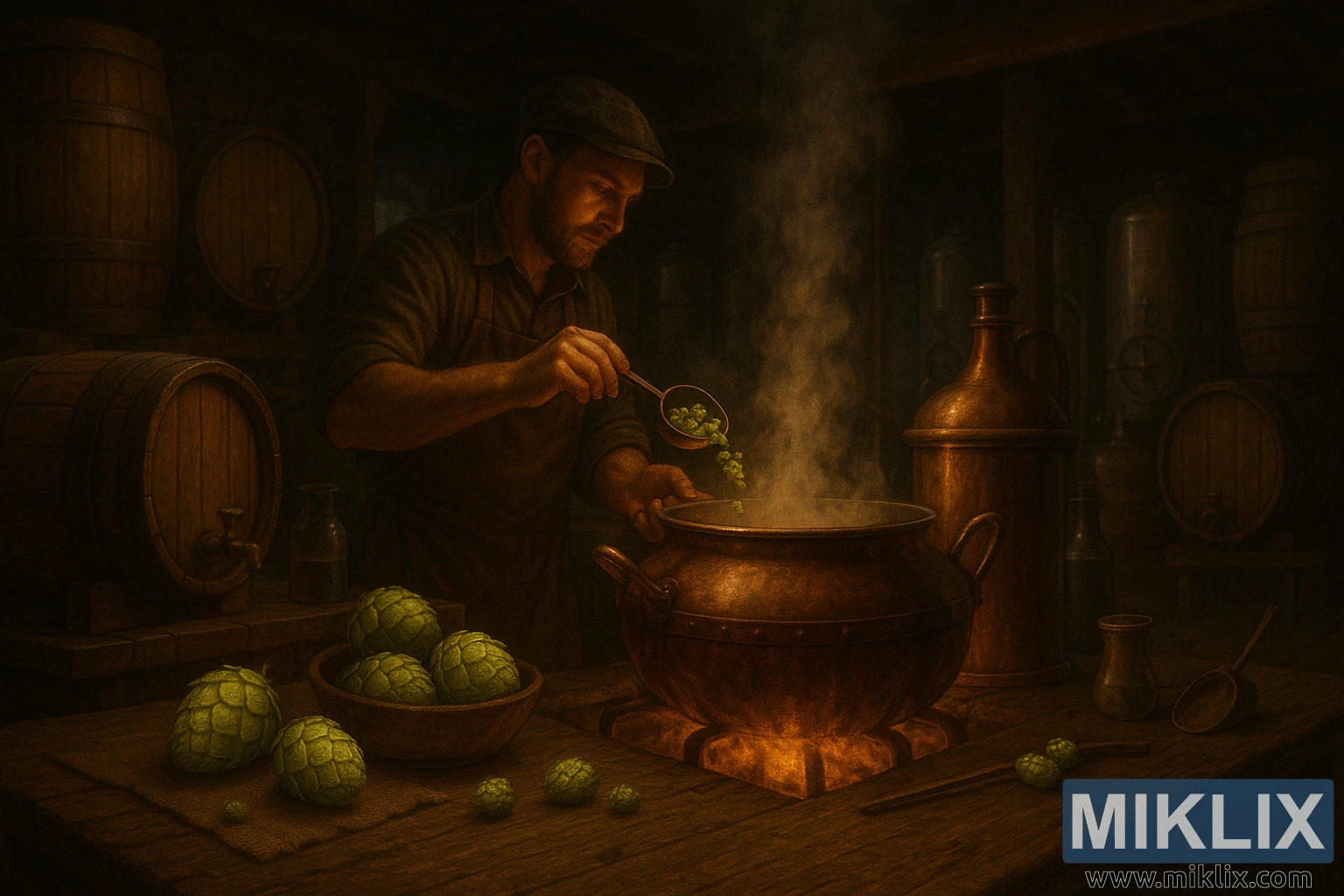 Slika obuhvaća bezvremenski trenutak u umjetnosti pivarstva, onaj koji se osjeća ukorijenjen u tradiciji i živ senzornom neposrednošću sadašnjosti. U središtu kompozicije stoji pivar, usredotočen na svoj zanat, njegova figura obasjana toplim sjajem koji dolazi iz bakrenog kotla na kamenom ognjištu. Para se diže u nježnim vrtlozima, noseći sa sobom opojan miris kipuće sladovine pomiješan s prepoznatljivim cvjetnim i voćnim notama svježe dodanog hmelja Melba. Pivarova koncentracija vidljiva je u načinu na koji drži kutlaču, pažljivo ubacujući zelene češere u kipuću tekućinu. Njegova kapa i jednostavna radna odjeća sugeriraju obrtnika koji se oslanja na intuiciju i iskustvo koliko i na odmjereni proces, utjelovljujući ravnotežu između znanosti i umjetnosti koja je oduvijek definirala izvrsno pivarstvo.