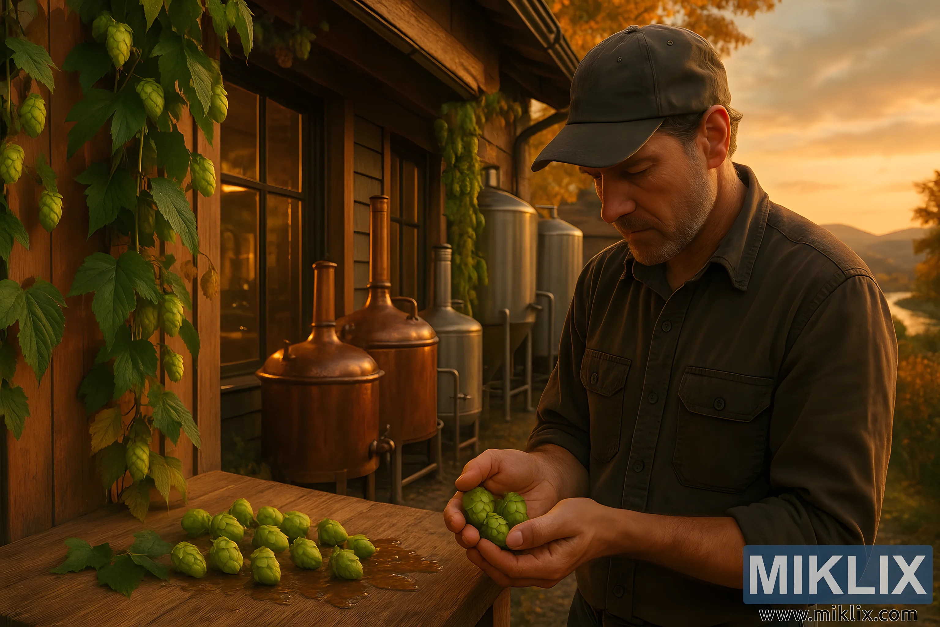 Pivovara u malom gradu s lozama hmelja Melba, bakrenim kotlovima i pivarom koji pregledava svježi hmelj, uz jesenska brda i blistavi zalazak sunca.