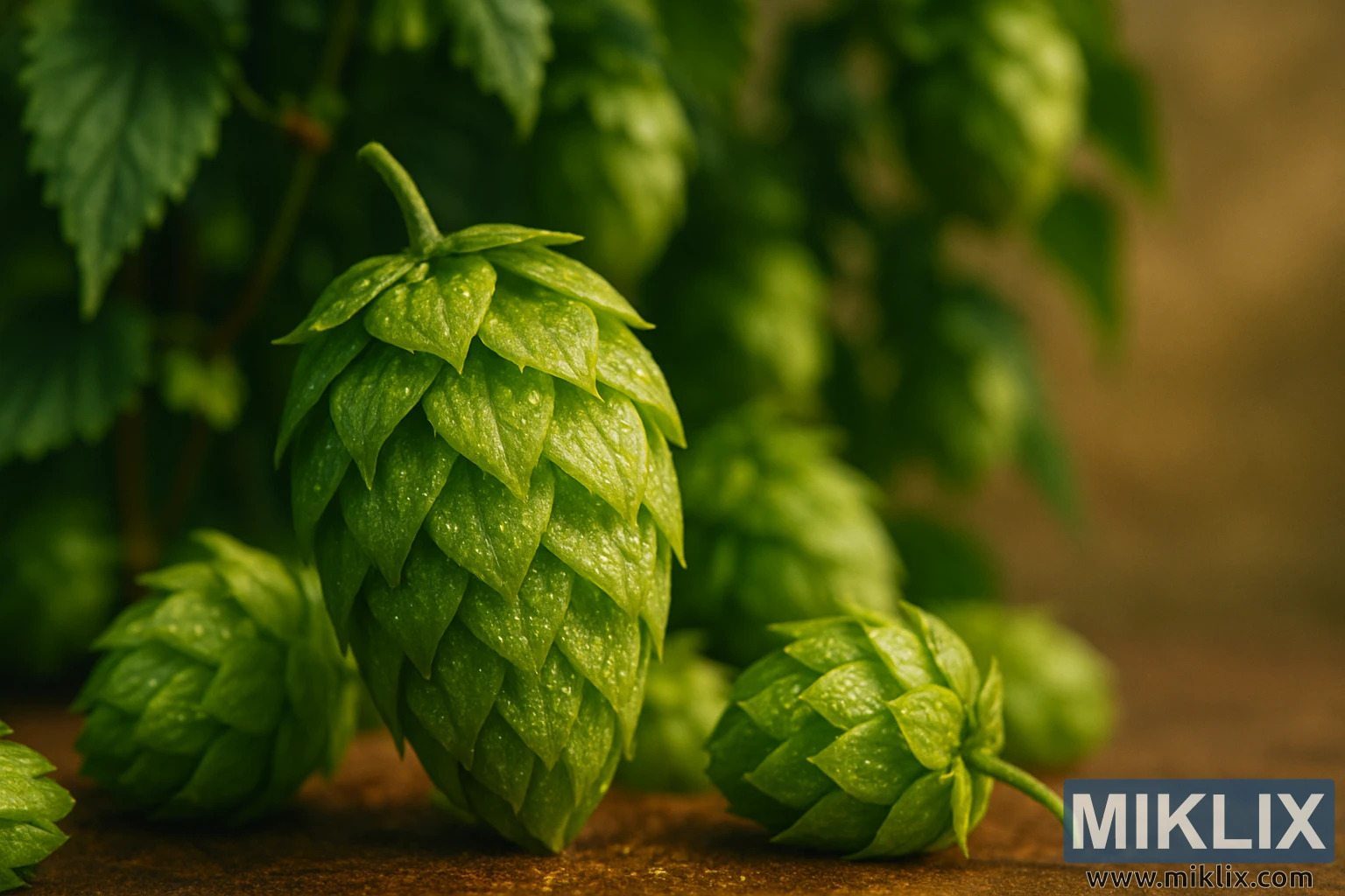 Iza češera, scena se širi u meku mutninu stabljika hmelja. Listovi, iako nejasni, odmah su prepoznatljivi, njihovi nazubljeni rubovi i bogati zeleni tonovi tvore teksturiranu pozadinu koja smješta češere u njihov prirodni okoliš. To je podsjetnik da ovaj hmelj ne postoji izolirano, već kao dio bujne, žive krošnje koja se penje prema nebu na rešetkama. Zemljani tonovi u najudaljenijoj pozadini besprijekorno se stapaju sa zelenilom, stvarajući osjećaj sklada i uzemljujući scenu u pastoralnoj atmosferi. Učinak je istovremeno smiren i impresivan, privlačeći pozornost na češere u prvom planu, a istovremeno nikada ne dopuštajući gledatelju da zaboravi širu priču o rastu, uzgoju i žetvi.