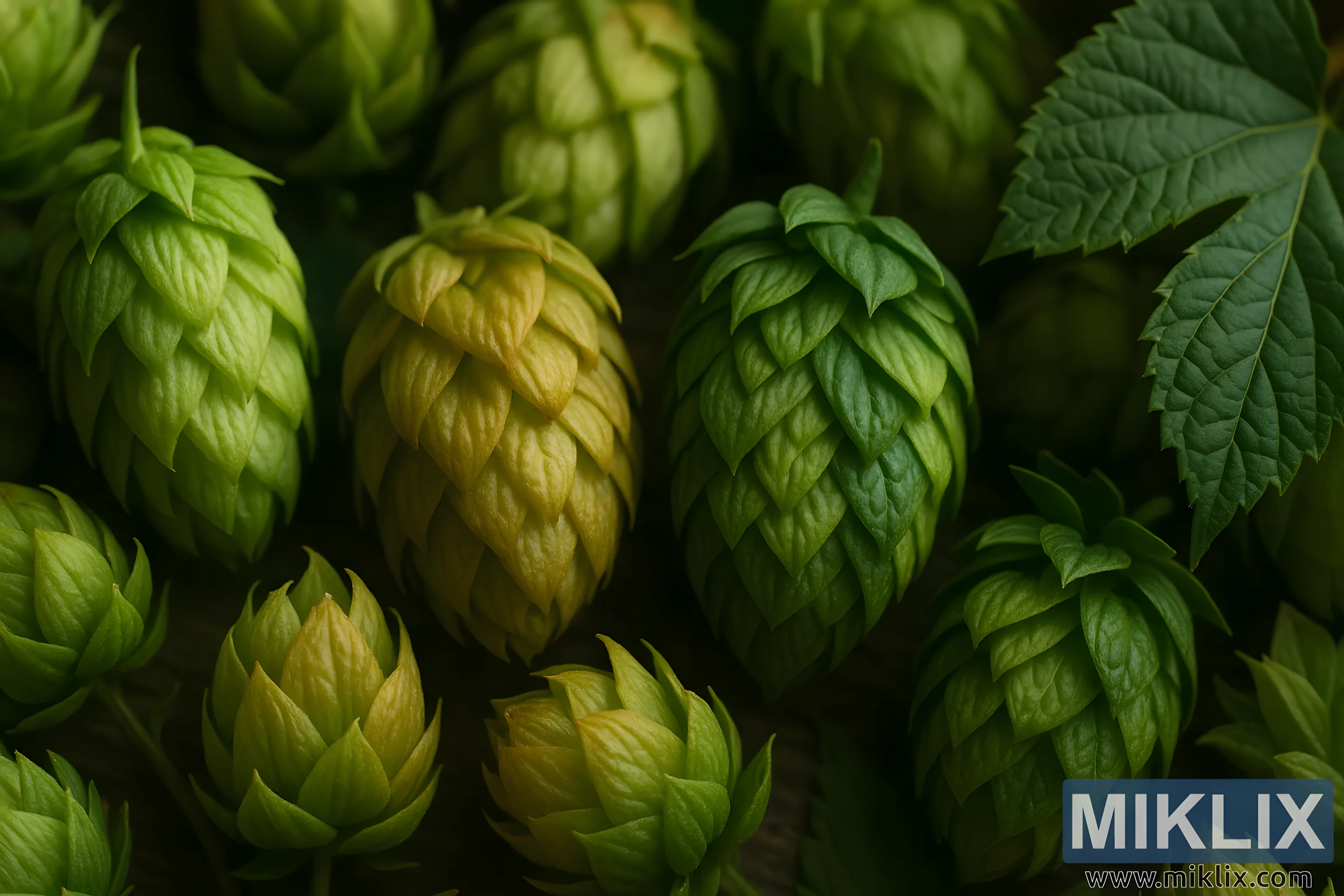 Perspektiva krupnog plana omogućuje duboko uvažavanje raznolikosti izložene na ekranu, sugerirajući suptilne razlike između kultivara hmelja. Neki češeri izgledaju puni i gusto zbijeni, sa sjajnom, živopisnom zelenom nijansom koja sugerira svježinu i vitalnost, dok drugi naginju prema žuto-zlatnim tonovima, nagovještavajući zrelost i oštre arome koje će se uskoro osloboditi u kipuću sladovinu. Među češerima leži širok, nazubljeni list, podsjetnik na veće penjačice s kojih su ovi cvjetovi ubrani, povezujući promatrača natrag s prostranim poljima s rešetkama gdje se biljke hmelja penju prema nebu u urednim redovima. Ovo suprotstavljanje mikro i makro elemenata - češera s njegovim pojedinačnim zrnima lupulina i lista s njegovim raširenim žilama - govori o dvojakoj prirodi hmelja kao osjetljivog poljoprivrednog proizvoda i snažnog sastojka za pivovarstvo.
