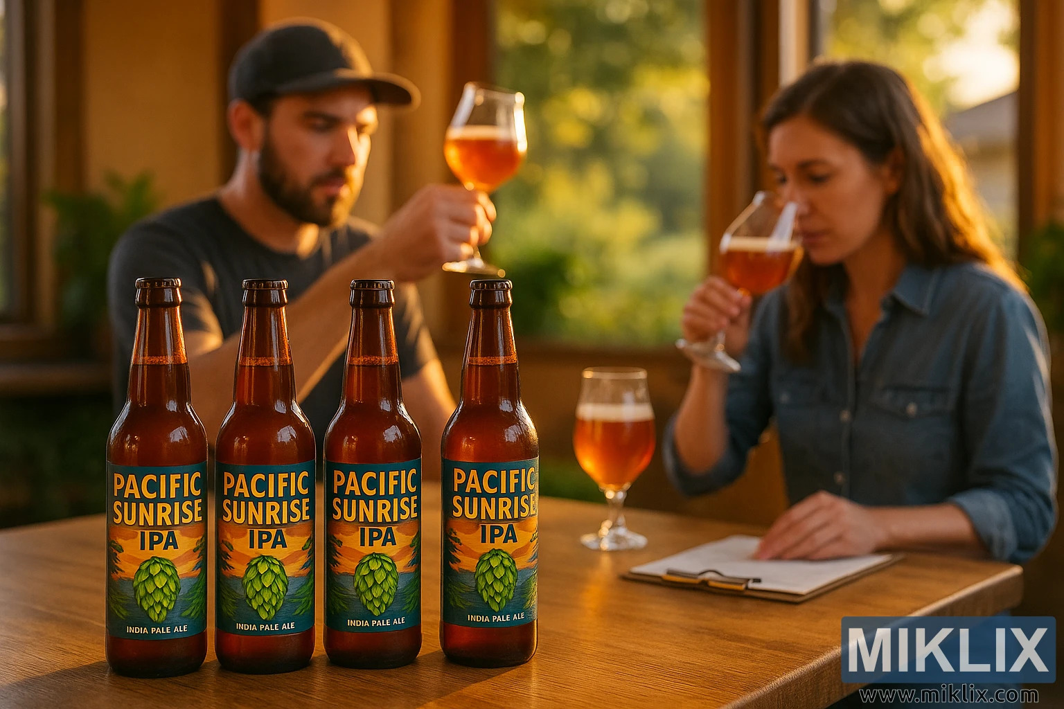 Slika prikazuje toplu, privlačnu scenu koja slavi umjetnost i strast iza craft pivarstva, s posebnim naglaskom na piva proizvedena korištenjem hrabre sorte hmelja Pacific Sunrise IPA. Kompozicija je promišljeno slojevita, privlačeći gledatelja od oštrih detalja boca u prvom planu do blago sjajne pozadine koja evocira bit pacifičkog sjeverozapada.