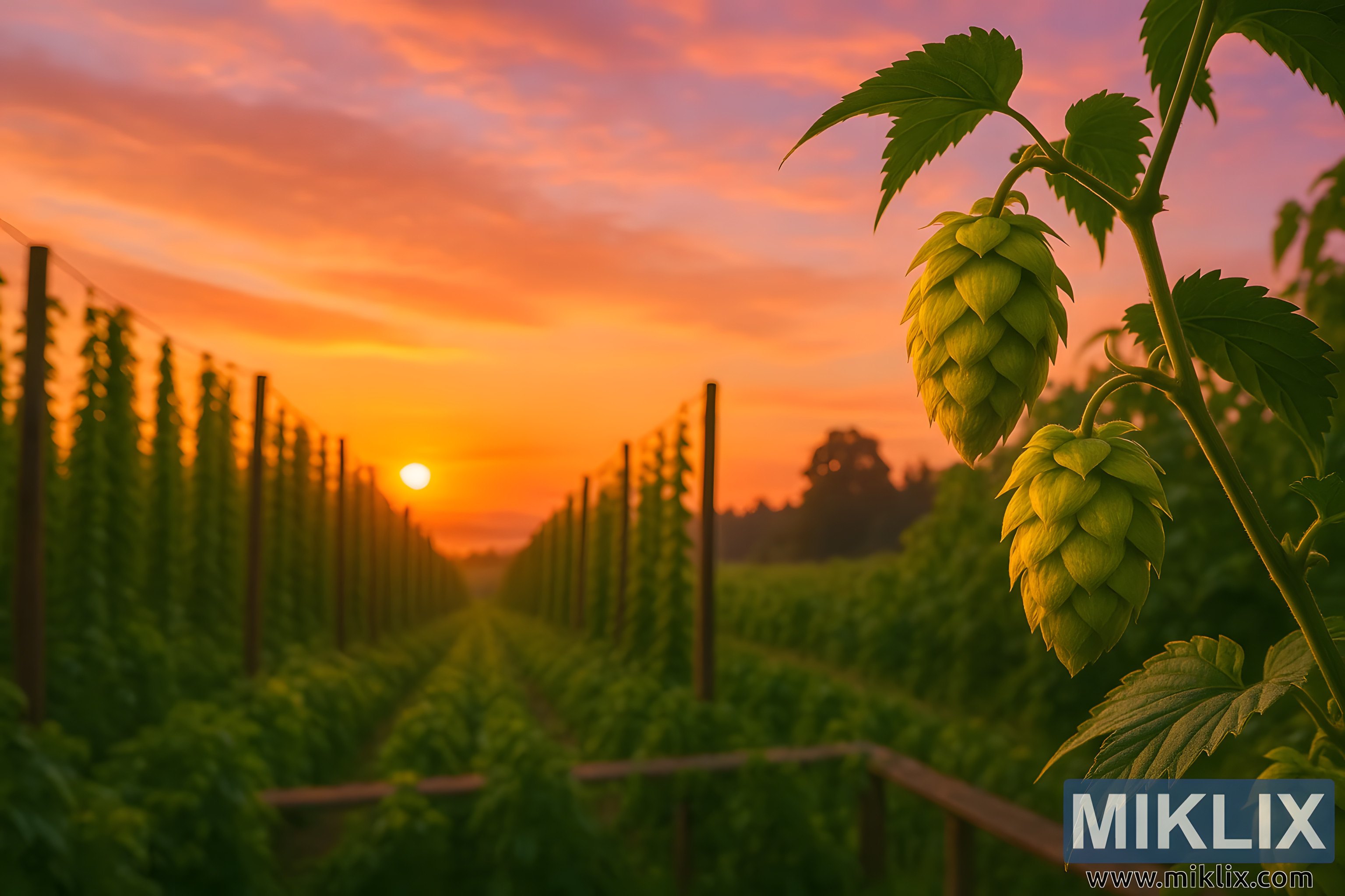 Slika prikazuje prekrasan izlazak sunca iznad zelenog polja hmelja, zračeći spokojnom, ali živahnom energijom koja utjelovljuje bit poljoprivrednog obilja. Scena je komponirana u slojevima, odvlačeći pogled od oštro detaljnih češera hmelja u prvom planu, preko urednih redova grozdova koji se protežu u daljinu, i konačno do dramatičnog neba obojenog blistavim bojama na horizontu.