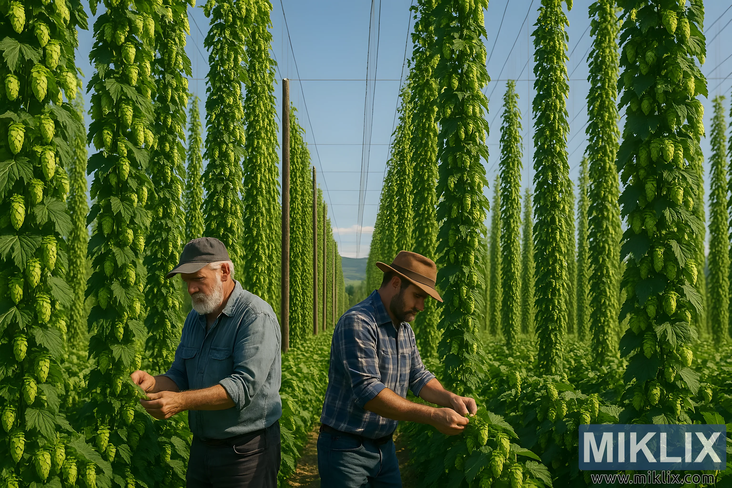 Slika prikazuje trenutak bezvremenske poljoprivredne prakse, gdje je uzgoj hmelja uzdignut na razinu umjetničkog oblika koji se prenosi generacijama. Visoki redovi Perle hmelja protežu se prema nebu u savršenom poravnanju, a svaka loza je prekrivena bujnim, smaragdnozelenim češerima koji nježno svjetlucaju u popodnevnom svjetlu. Biljke, poduprte zamršenim sustavom rešetki od visokih drvenih stupova i zategnutih žičanih užadi, tvore gotovo katedralsku strukturu, a njihovo gusto lišće stvara okomite zidove zelenila koji se čini kao da se beskrajno protežu u horizont. Simetrija rešetki pojačava osjećaj reda i preciznosti, naglašavajući pedantnu brigu koja definira uzgoj hmelja u svom najboljem izdanju.