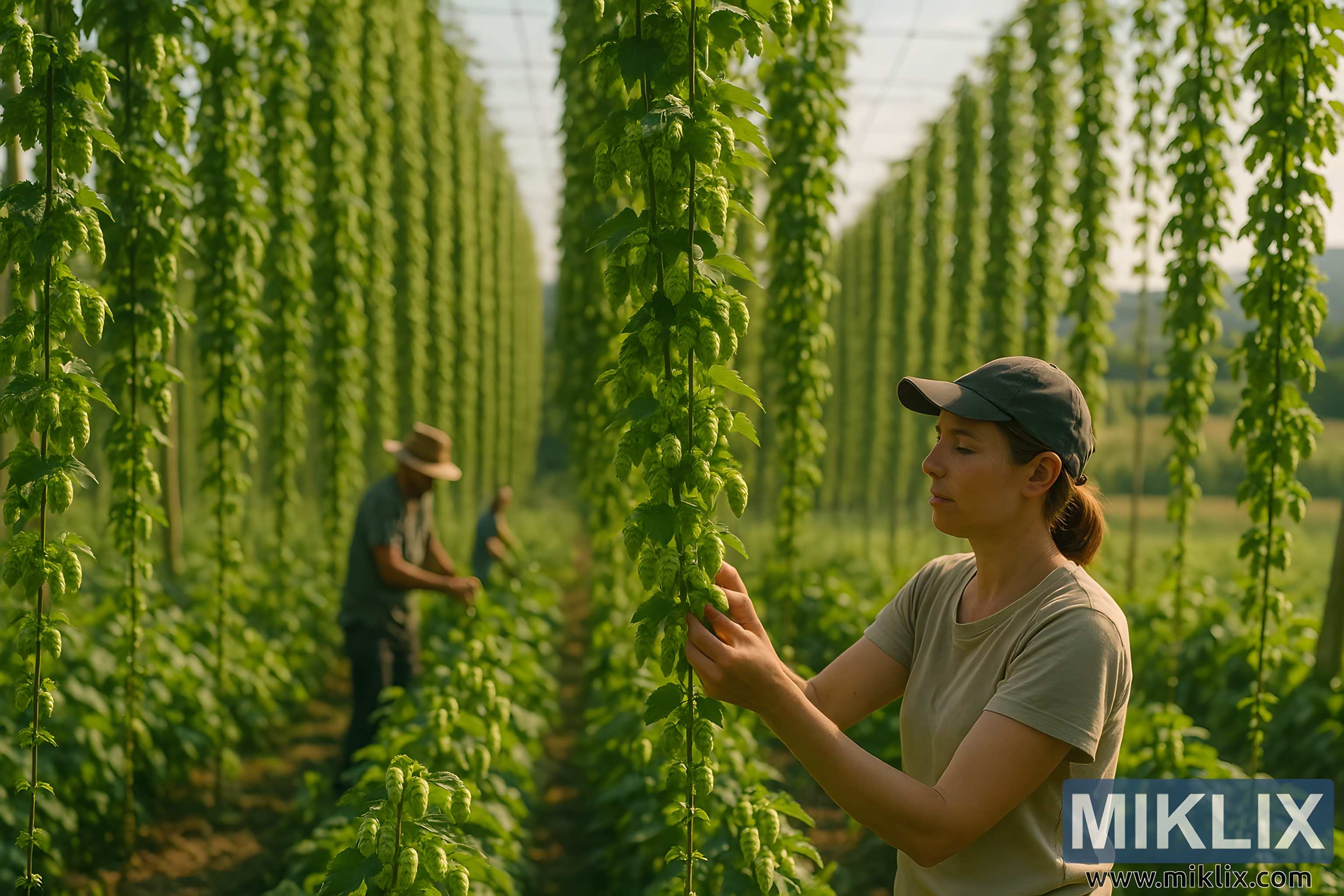 prvom planu, žena stoji u tihoj koncentraciji, rukama pažljivo razdvaja listove dok pregledava zrelost češera. Izraz usredotočenosti na njezinom licu prenosi ozbiljnost njezina zadatka - ovo nije samo poljoprivreda, već upravljanje vitalnim sastojkom čija kvaliteta definira konačni napitak. Ispituje teksturu, čvrstoću i aromu hmelja, oslanjajući se na znanje preneseno i usavršavano kroz sezone obrađivanja ovih polja. Svaki češer kojeg dotakne nosi u sebi lupulinske žlijezde koje sadrže eterična ulja i kiseline, alkemijske elemente koji pretvaraju jednostavnu sladovinu u pivo sa složenošću, ravnotežom i dušom.