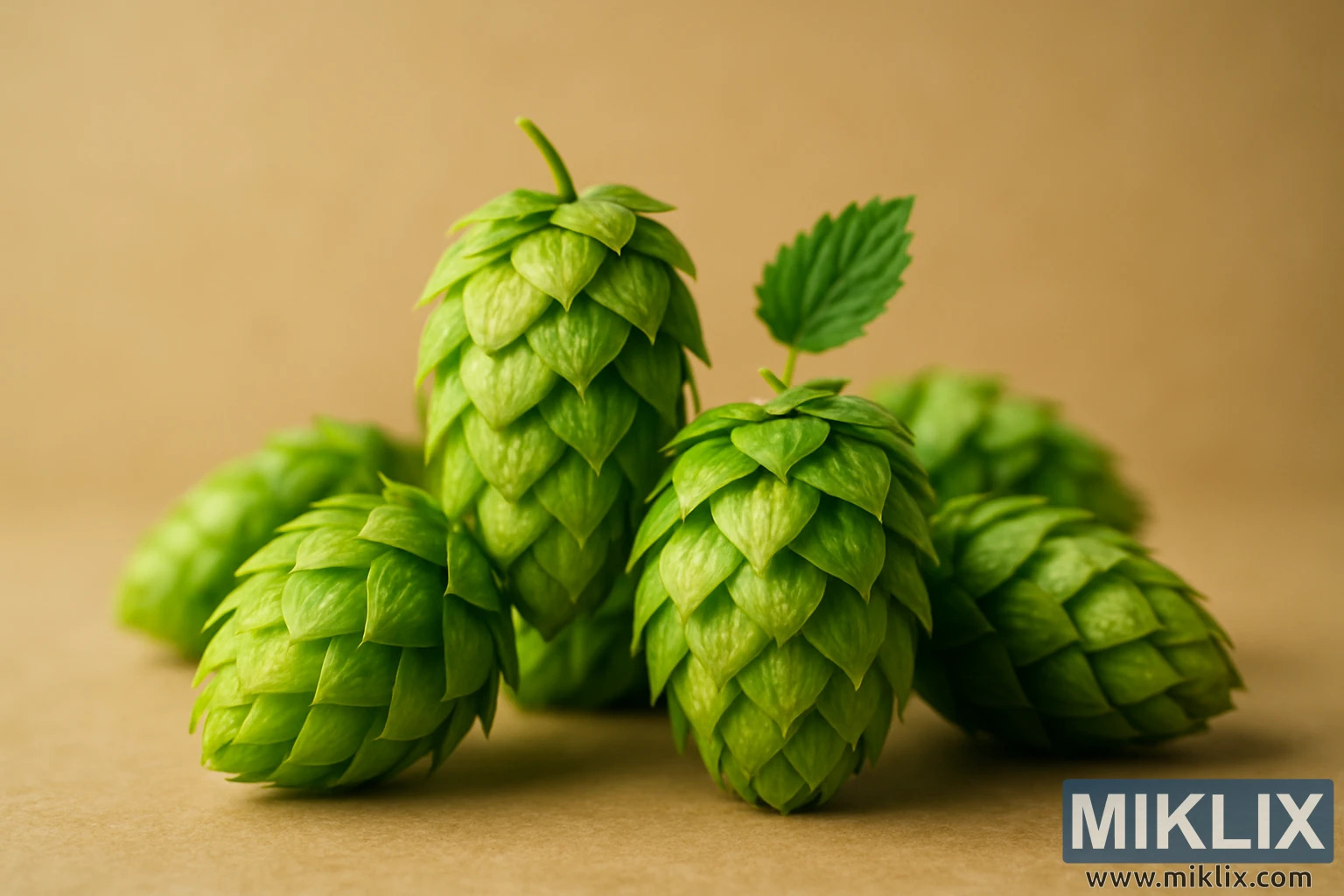Izbor pozadine je namjeran u svojoj suzdržanosti. Topla, neutralna kulisa stvara spokojnu i urednu pozornicu na kojoj hmelj može privući punu pozornost. Njegova zemljana bež nijansa nadopunjuje živopisnu zelenu boju češera, uzemljujući ih u organskoj paleti koja evocira tlo, polja i suncem obasjane žetve. Bez ikakvih ometanja, pogled gledatelja u potpunosti je privučen zamršenim teksturama i strukturama samog hmelja. Ova jednostavna pozadina ne samo da poboljšava vizualnu jasnoću češera, već i naglašava njihovu simboličku važnost kao neopjevanih heroja pivarstva. To je slika koja uklanja višak i slavi esencijalnost.