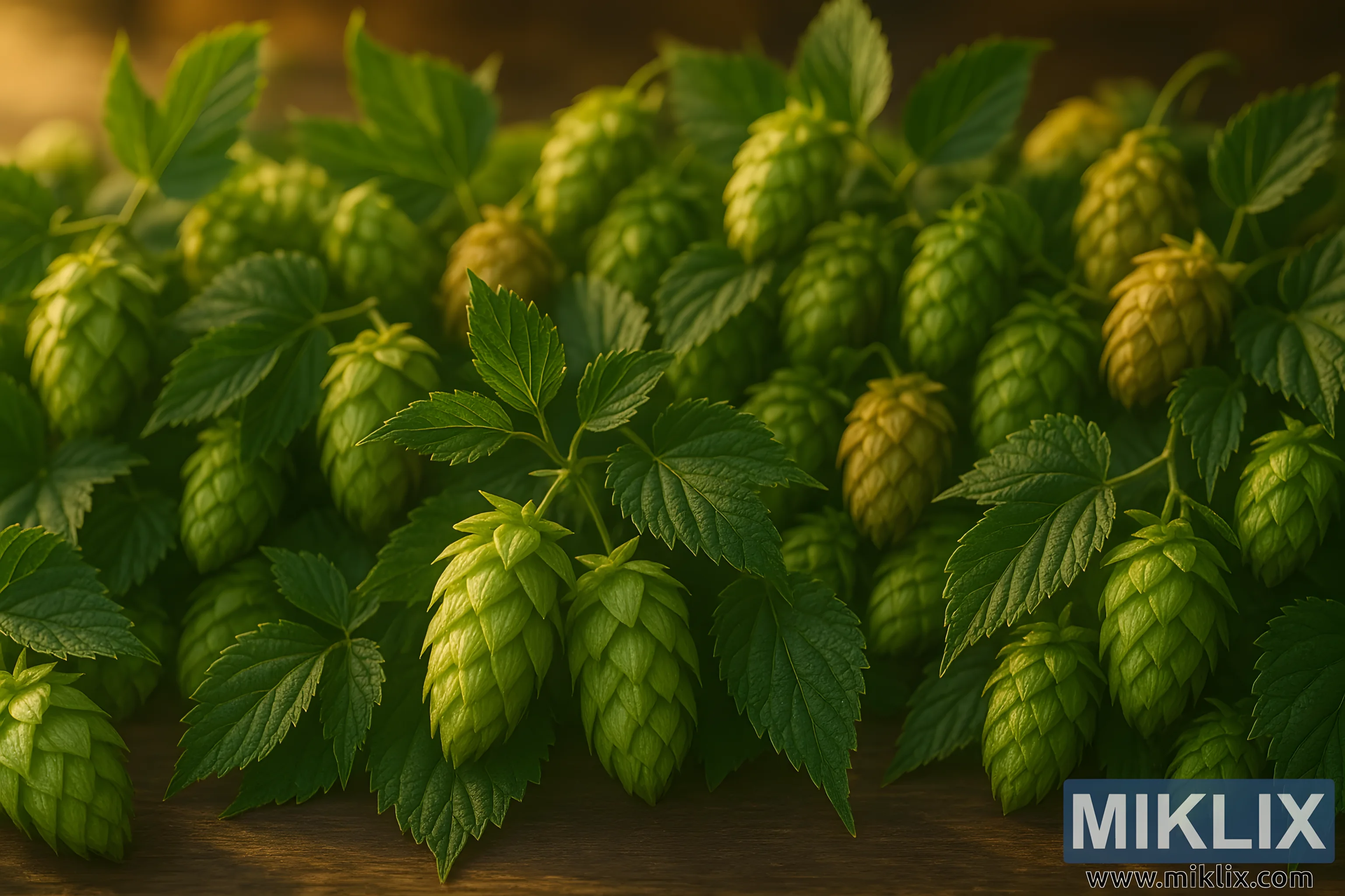 Slika se razvija poput proslave doprinosa prirode pivarstvu, s pažljivo aranžiranim prikazom češera hmelja raširenih u velikodušnim grozdovima po kadru. Svaki češer, bujan i smolast, zrači vitalnošću pod zlatnim svjetlom koje struji sa strane, bacajući tople naglaske i nježne sjene koje naglašavaju njihove slojevite strukture. U prvom planu dominira hmelj Sterling, njegovi šiljasti listovi i izduženi češeri ističu se precizno, a njihova jarko zelena nijansa sugerira i svježinu i aromatični potencijal. Sterling, poznat po svojim uravnoteženim biljnim, začinskim i citrusnim notama, ovdje djeluje kao sidro kompozicije, utjelovljujući i tradiciju i svestranost. Njihova prisutnost uzemljuje scenu, aludirajući na sortu hmelja koju pivari dugo preferiraju tražeći suptilnu eleganciju, a ne prejak karakter.