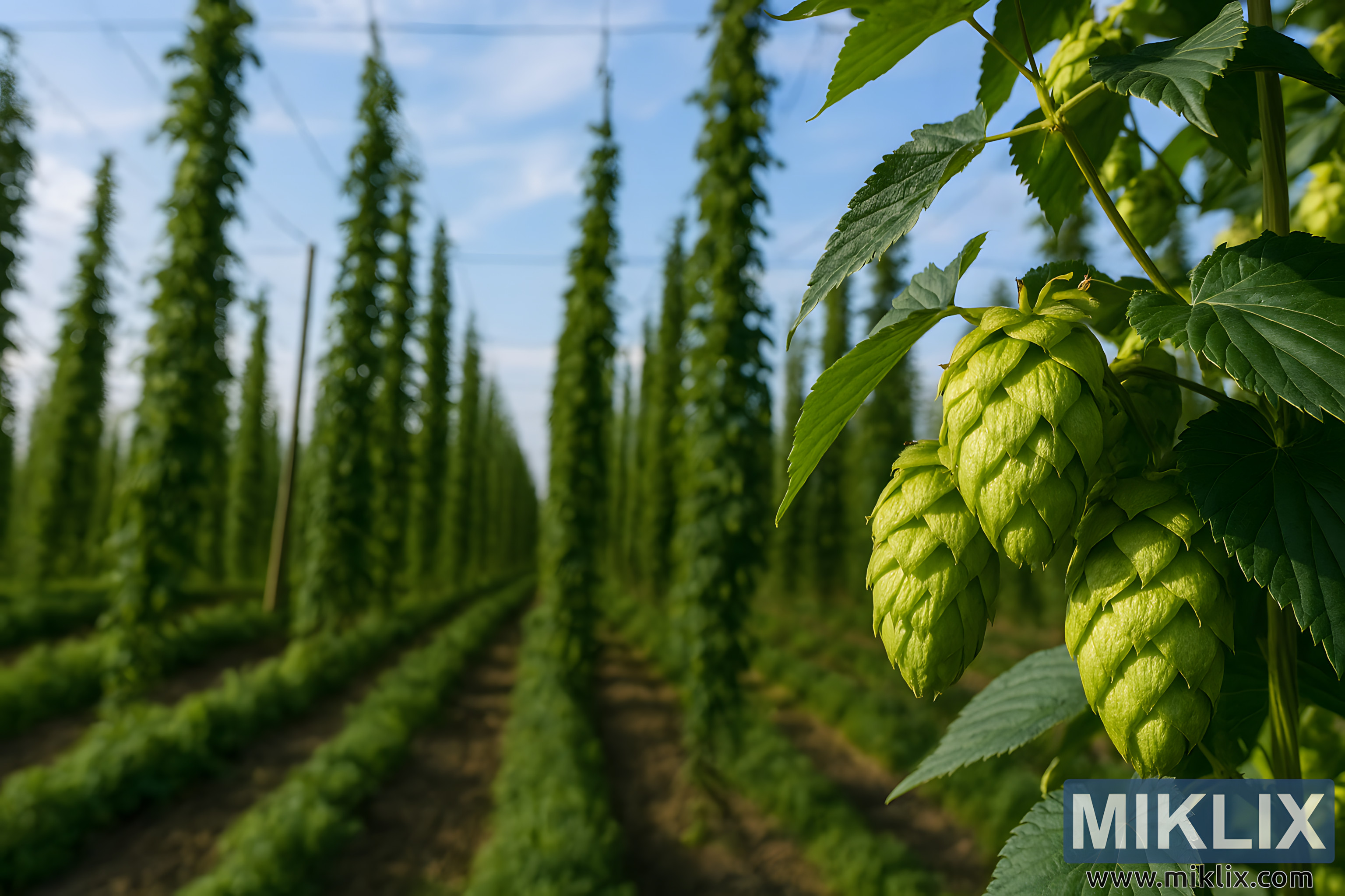 Kompozicija uravnotežuje tehničke detalje i prirodnu ljepotu: oštro fokusirani prednji plan skreće pozornost na botaničke značajke hmelja Štajerski Golding, dok prostrano polje i sustav rešetki pružaju kontekst za njihov uzgoj. Ova slika idealna je za obrazovnu, promotivnu i katalošku upotrebu, prikazujući poljoprivrednu eleganciju i važnost hmelja Štajerski Golding za pivovarstvo u vrhuncu vegetacijske sezone.