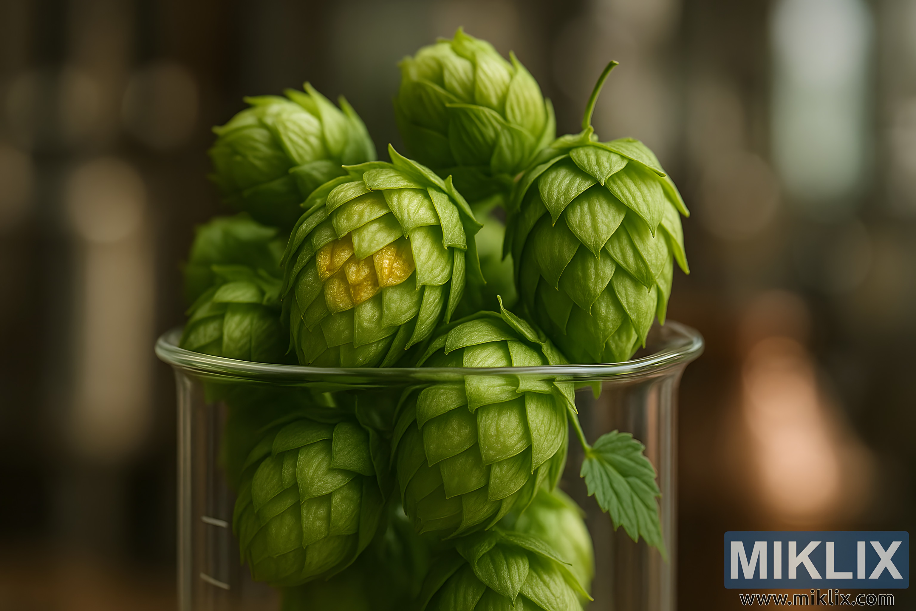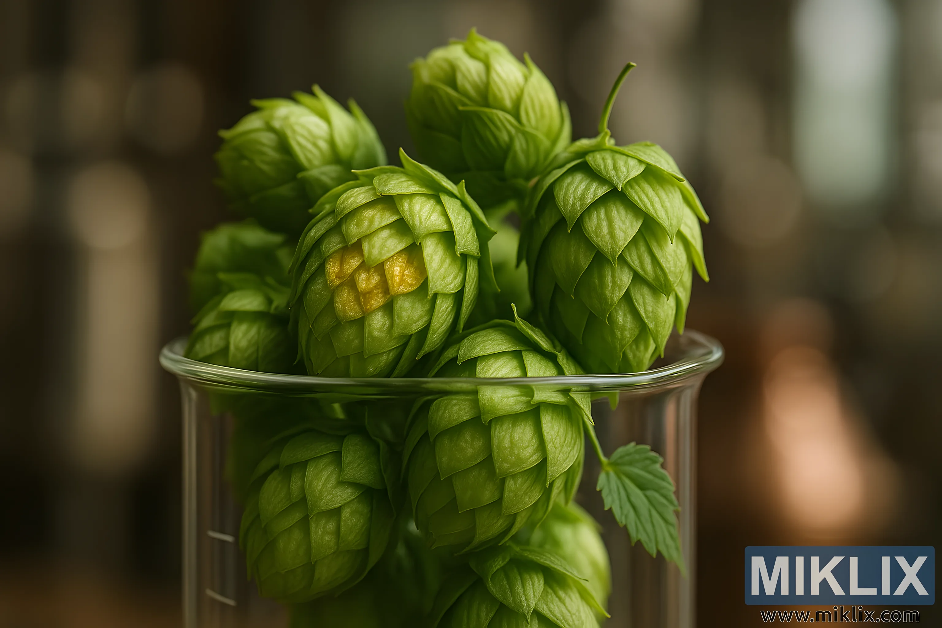 Fotografija prikazuje delikatnu ljepotu i znanstvenu intrigu štajerskog hmelja Golding, uredno složenog unutar prozirnih stijenki staklene čaše. Ova neobična prezentacija odmah premošćuje jaz između poljoprivrede i znanosti, podsjećajući gledatelja da je pivarstvo i prirodni zanat i precizan, metodičan proces. Češeri, puni i živahni, bogate su zelene boje, a njihovi preklapajući brakteji tvore zamršene uzorke koji djeluju i uređeno i organski. Smješteni među njima, proviruju sitne mrlje zlatnog lupulina, nježno sjajeći pod difuznim prirodnim svjetlom. Ove smolaste žlijezde, iako male, posjeduju ogromnu moć - koncentrirana ulja i kiseline koje oblikuju gorčinu, okus i aromu piva. Njihova vidljivost na slici čini ih gotovo dragocjenima, kao da se naslućuje sama bit pivarstva zaključana unutar ovih krhkih češera.