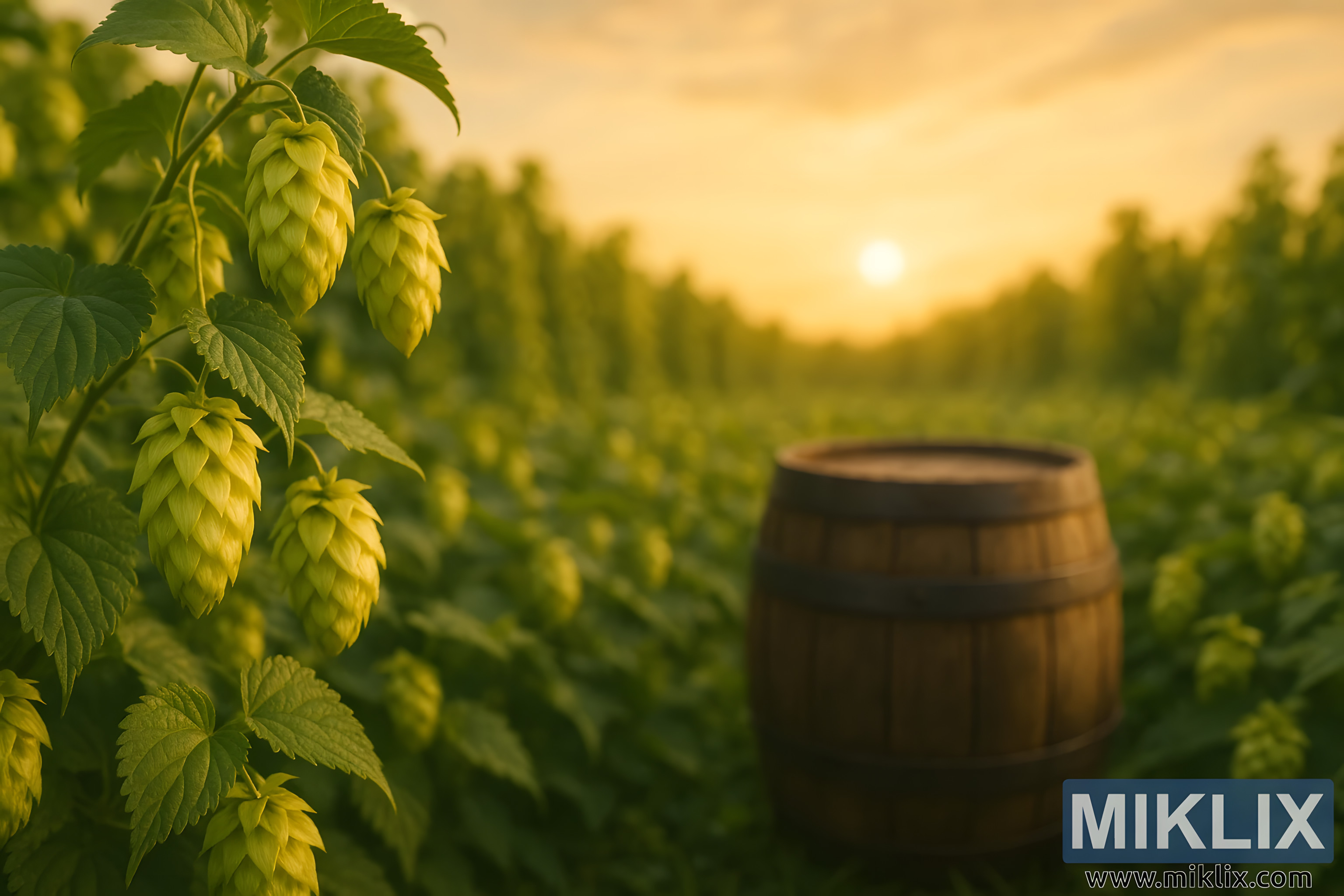 Suncem obasjano polje hmelja Sunbeam s rustikalnom bačvom, koje pokazuje jarko zeleno lišće i zlatne češere za zanatsko pivovarstvo.