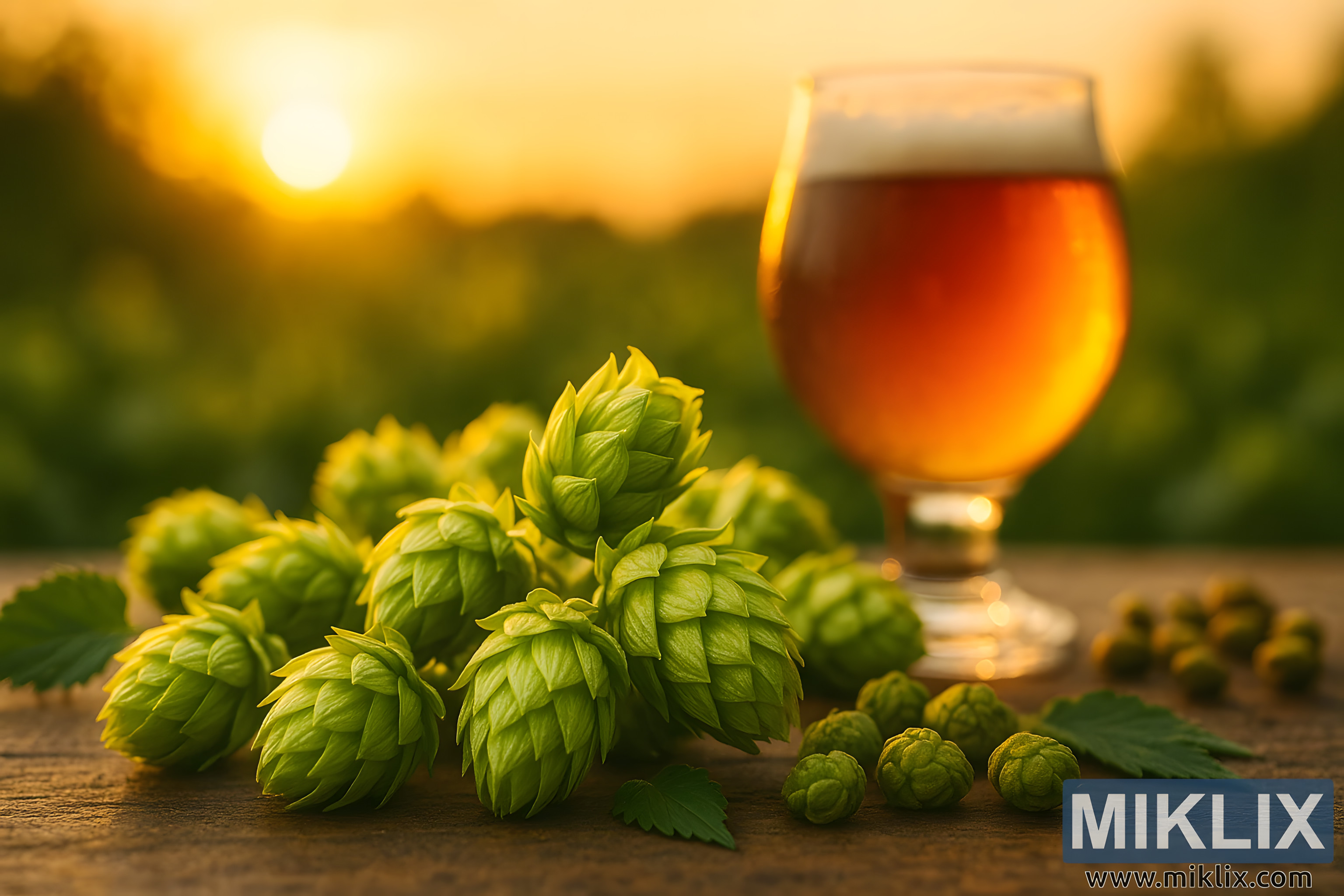 Odmah iza hmelja, u sredini, nalazi se čaša tulipana jantarnog piva, vrhunac ovog botaničkog putovanja od zrna do piva. Pivo toplo sjaji na zalazećem suncu, njegovo zlatnocrveno tijelo svjetluca od bistrine, dok skromna kruna pjene počiva na vrhu, simbol svježine i vitalnosti. Način na koji čaša hvata i lomi večernje svjetlo naglašava transformaciju u srži pivarstva - skok od zelenog konusa do tekućeg zlata, od sirove biljke do ručno rađenog iskustva. Njegova prisutnost govori ne samo o osvježenju već i o narativu, o namjernim izborima pivara u uravnoteženju slatkoće slada s gorčinom hmelja, arome i složenosti. Veza između svijetlih konusa u prvom planu i svjetlucavog pića odmah iza njih je nepogrešiva, vizualni dijalog između sastojka i rezultata.