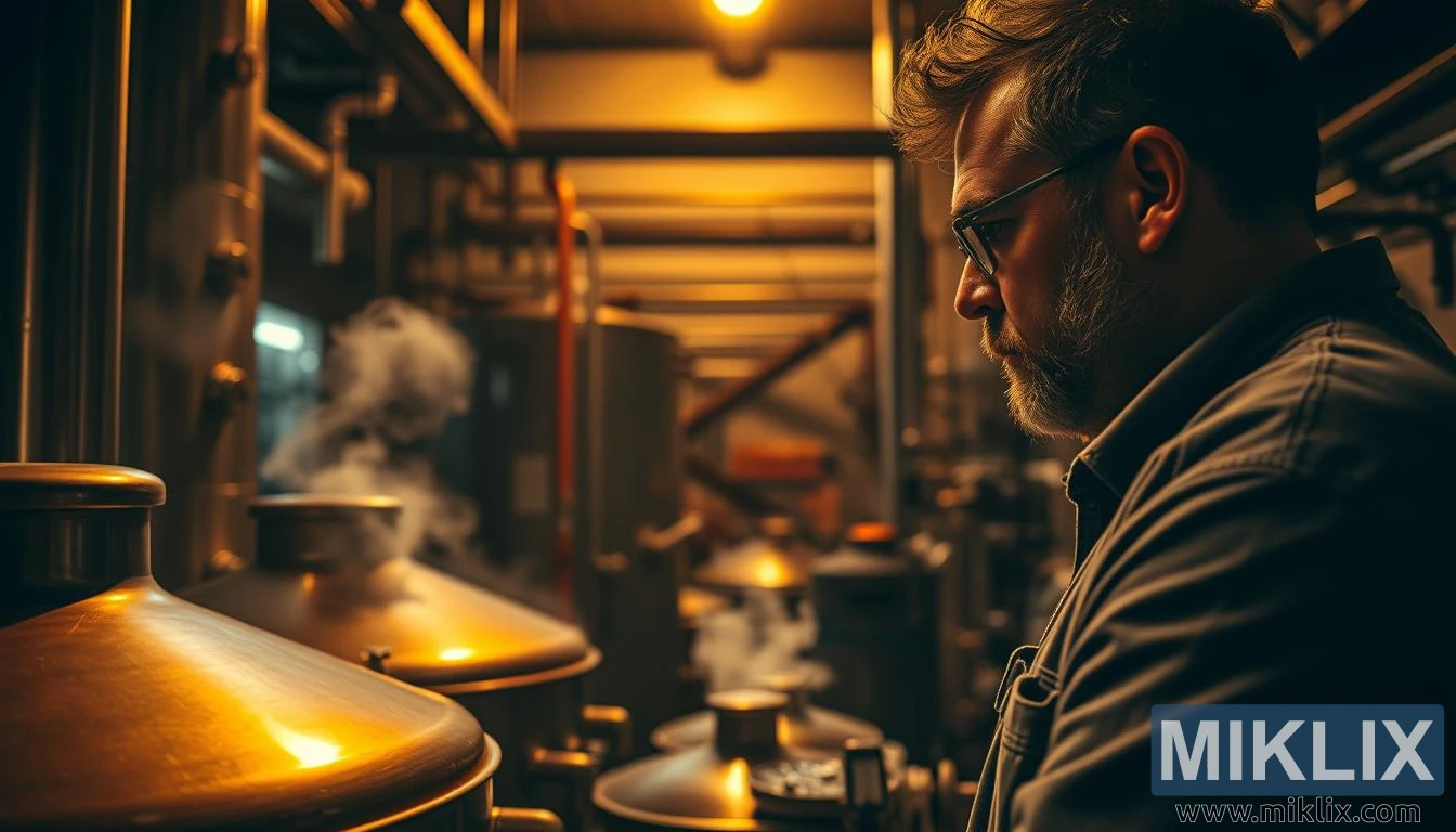 Oko njega, pivovara je labirint spremnika od nehrđajućeg čelika, cijevi i mjerača, a svaki dio je bitan dio većeg sustava koji pretvara vodu, žito, kvasac i hmelj u tekuću umjetnost. Para se diže ne samo iz bakrenih kotlova već i iz manjih otvora i ventila, a vitice se šire u mračan prostor poput fizičke manifestacije pivskog duha u njegovom najranijem obliku. Sjene se lijepe za strop i gornje zidove, dok polirane površine posuda za kuhanje bacaju bljesak svjetlosti, stvarajući ravnotežu između misterije i jasnoće, između onoga što je vidljivo i onoga što je još u transformaciji.