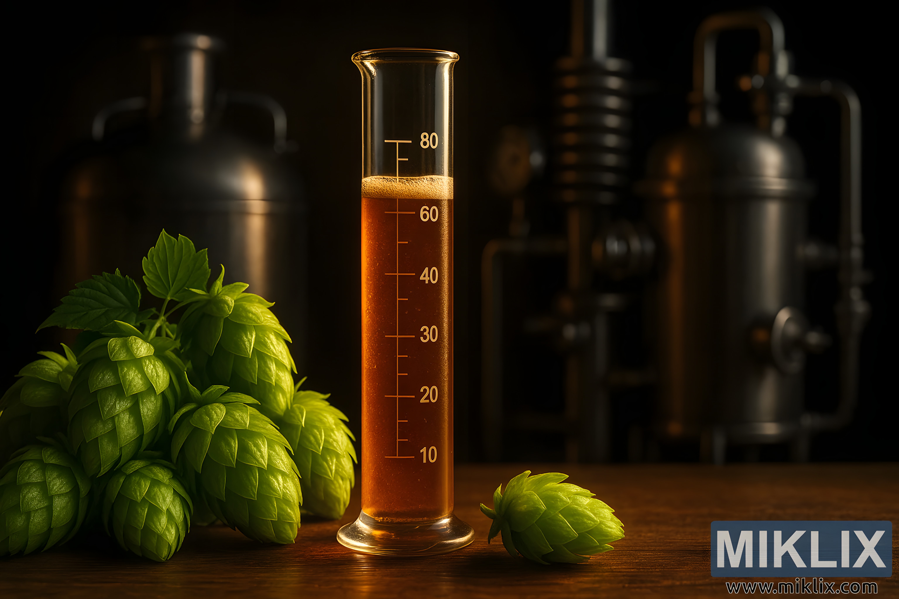 Dramatična kompozicija koja prikazuje češere hmelja Toyomidori, užarenu epruvetu sladovine i zamućene spremnike za kuhanje od nehrđajućeg čelika koji simboliziraju umijeće i preciznost.
