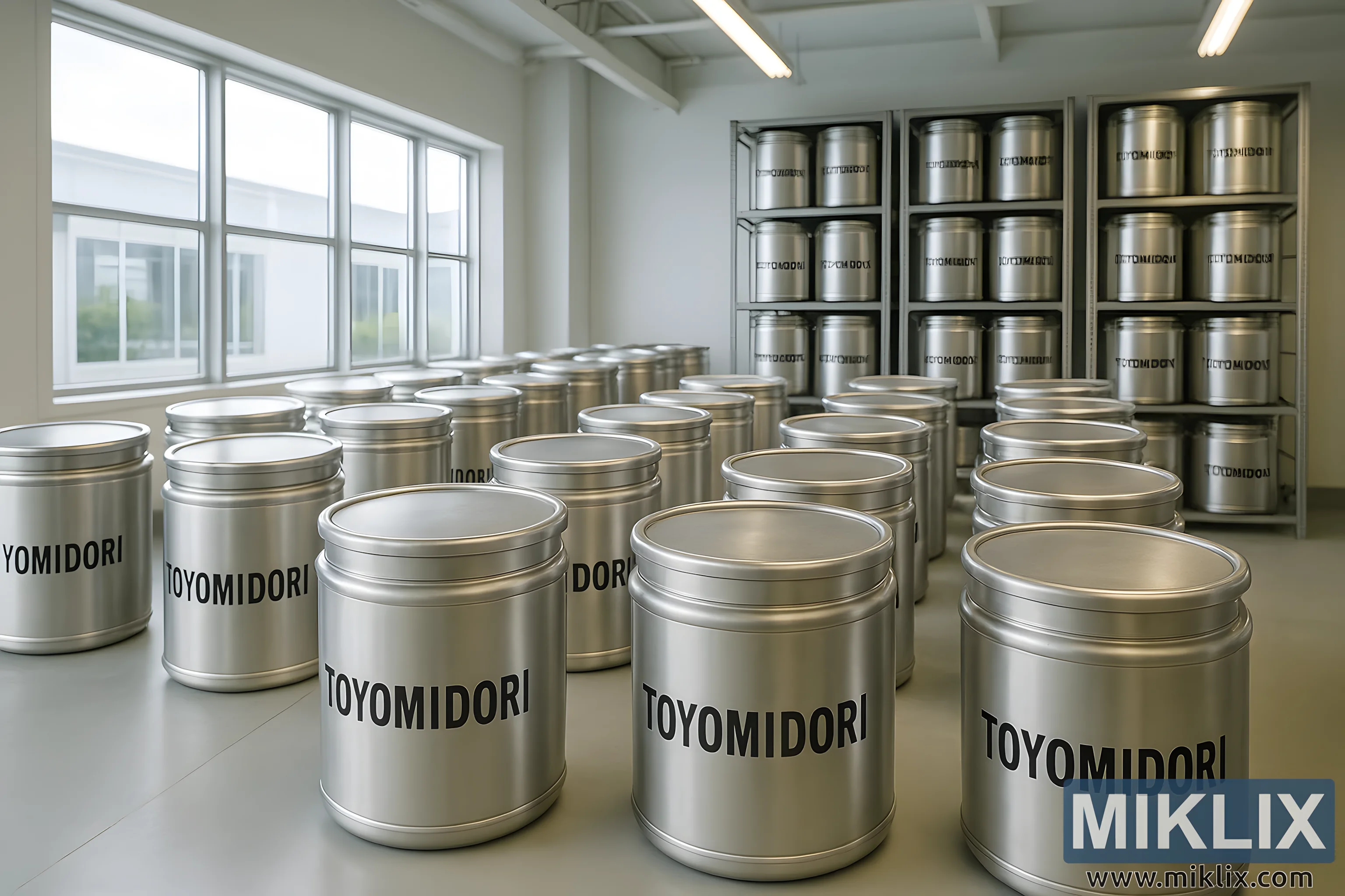 prvom planu i protežući se u srednji dio, prostorom dominiraju redovi cilindričnih spremnika od nehrđajućeg čelika. Svaki spremnik je identičnog oblika i završne obrade, a njihove brušene metalne površine hvataju meke odraze dnevnog svjetla koje se ulijeva kroz velike prozore duž lijeve strane okvira. Spremnici su označeni s "TOYOMIDORI" podebljanim, crnim slovima bez serifa, otisnutim čisto i istaknuto preko njihovih zakrivljenih strana. Ujednačena tipografija daje dašak standardizacije i osiguranja kvalitete, pojačavajući dojam da je ono što sadrže vrijedno i pažljivo upravljano. Njihovi poklopci su čvrsto zatvoreni, rubovi savršeno poravnati, a s geometrijskom preciznošću stoje na glatkom, poliranom betonskom podu. Suptilne varijacije svjetla na metalnim površinama stvaraju dubinu i osjećaj opipljive težine, dok meke sjene ispod svakog cilindra vizualno ih usidravaju u prostor.