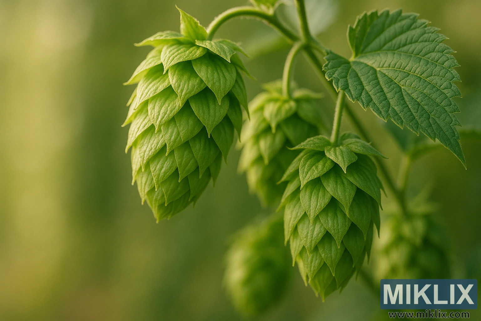 Iza češera, blago zamućena pozadina rasutog lišća pruža kontekst bez ometanja. Međuigra između oštrine prednjeg plana i glatkog tonskog gradijenta pozadine stvara osjećaj uronjenosti, kao da gledatelj stoji usred žive, dišuće biljke hmelja. Paleta boja - kojom dominiraju svježe zelene s podtonovima jantarne svjetlosti - sugerira vitalnost, čistoću i rast, dok toplina osvjetljenja nagovještava kasnopopodnevnu sunčevu svjetlost koja se filtrira kroz lišće.