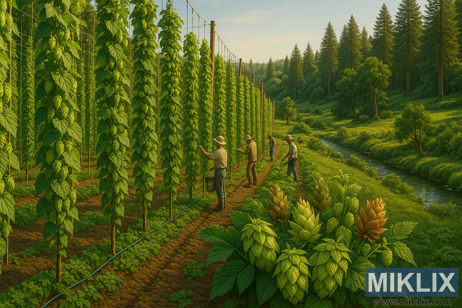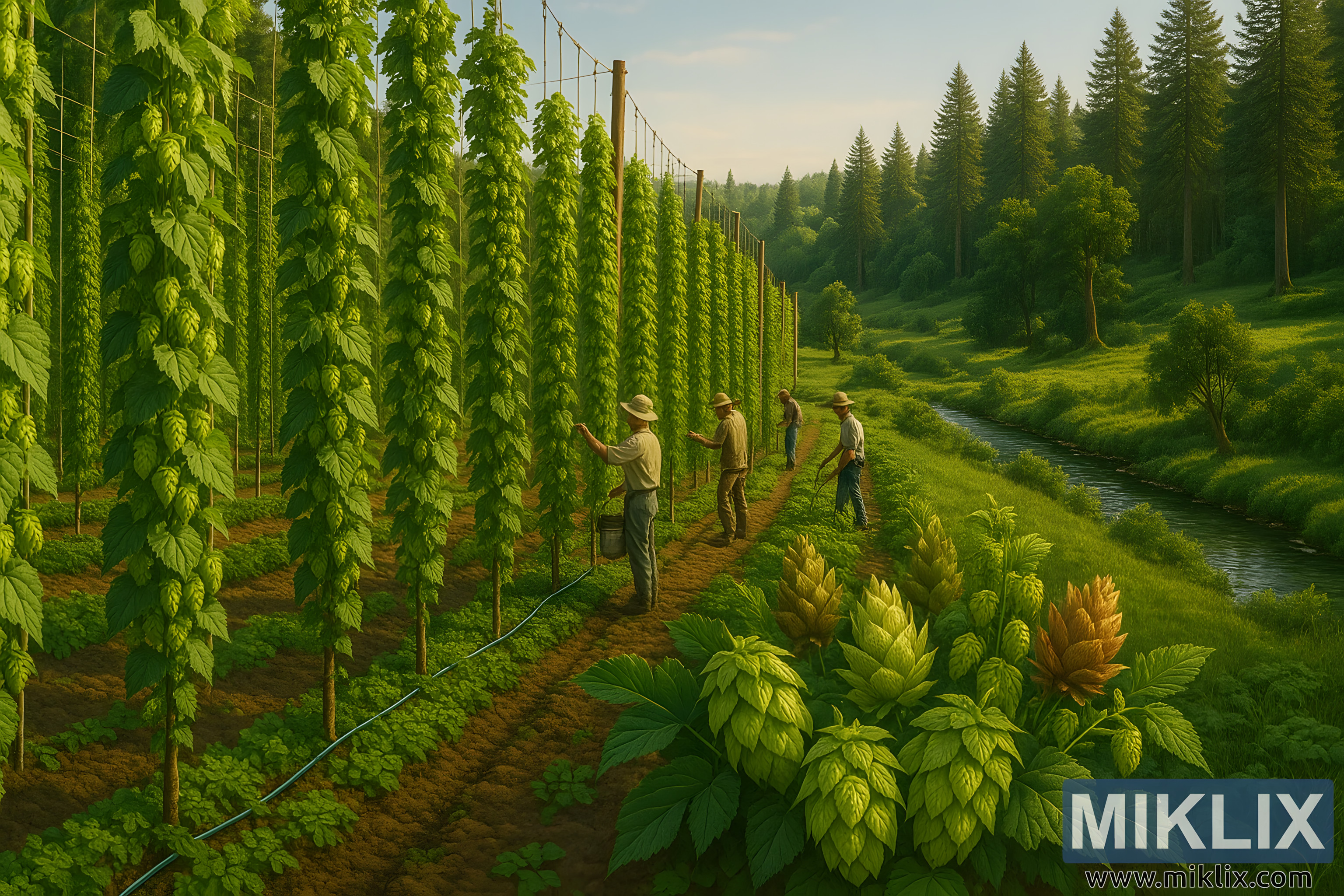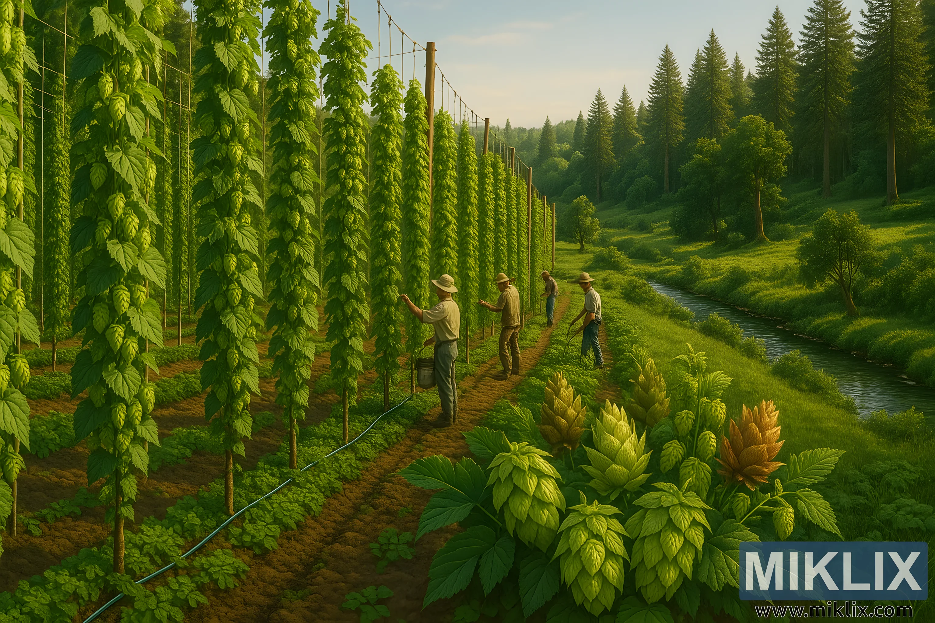 Uz redove, skupina poljoprivrednika radi s tihom preciznošću, uvježbanim, ali nježnim gestama. Noseći šešire širokog oboda koji ih štite od sunca, metodično se kreću niz rešetke, pregledavajući zrelost češera, provjeravajući lišće na znakove štetnika i osiguravajući da svaka biljka dobije odgovarajuću ravnotežu vode i hranjivih tvari. Njihovi alati su jednostavni - kante, ljestve, škare za rezidbu - no njihova vještina pretvara zadatak u nešto što se čini bližim upravljanju nego pukom radu. Sustav navodnjavanja koji prolazi duž tla ispod grozdova govori o modernoj održivosti, dostavljajući vodu izravno korijenju i minimizirajući otpad. Ovi poljoprivrednici su više od uzgajivača; oni su čuvari nasljeđa, spajajući tradicionalne metode sa suvremenom ekološkom osviještenošću.