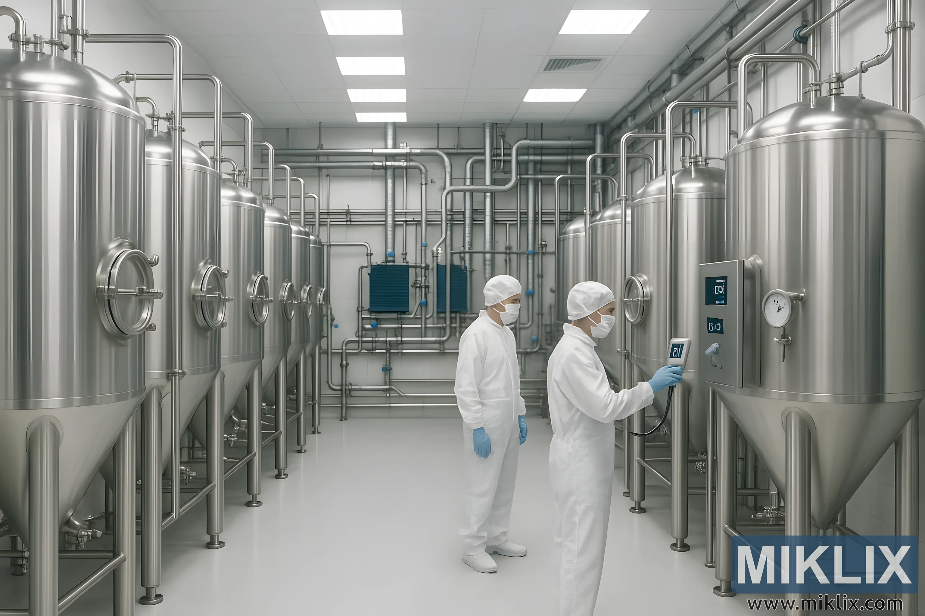 Slika visoke rezolucije sterilnog skladišta lager kvasca s spremnicima, tehničarima i preciznom kontrolom temperature.
