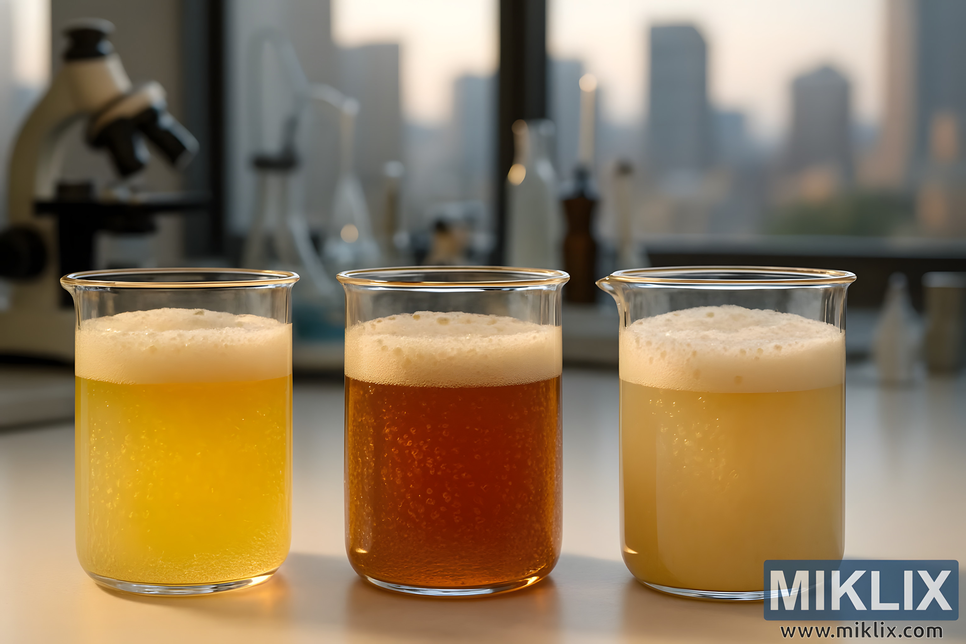 Čaše s različitim fermentacijama lager kvasca u preciznom laboratorijskom okruženju s instrumentima i zamućenom urbanom pozadinom.