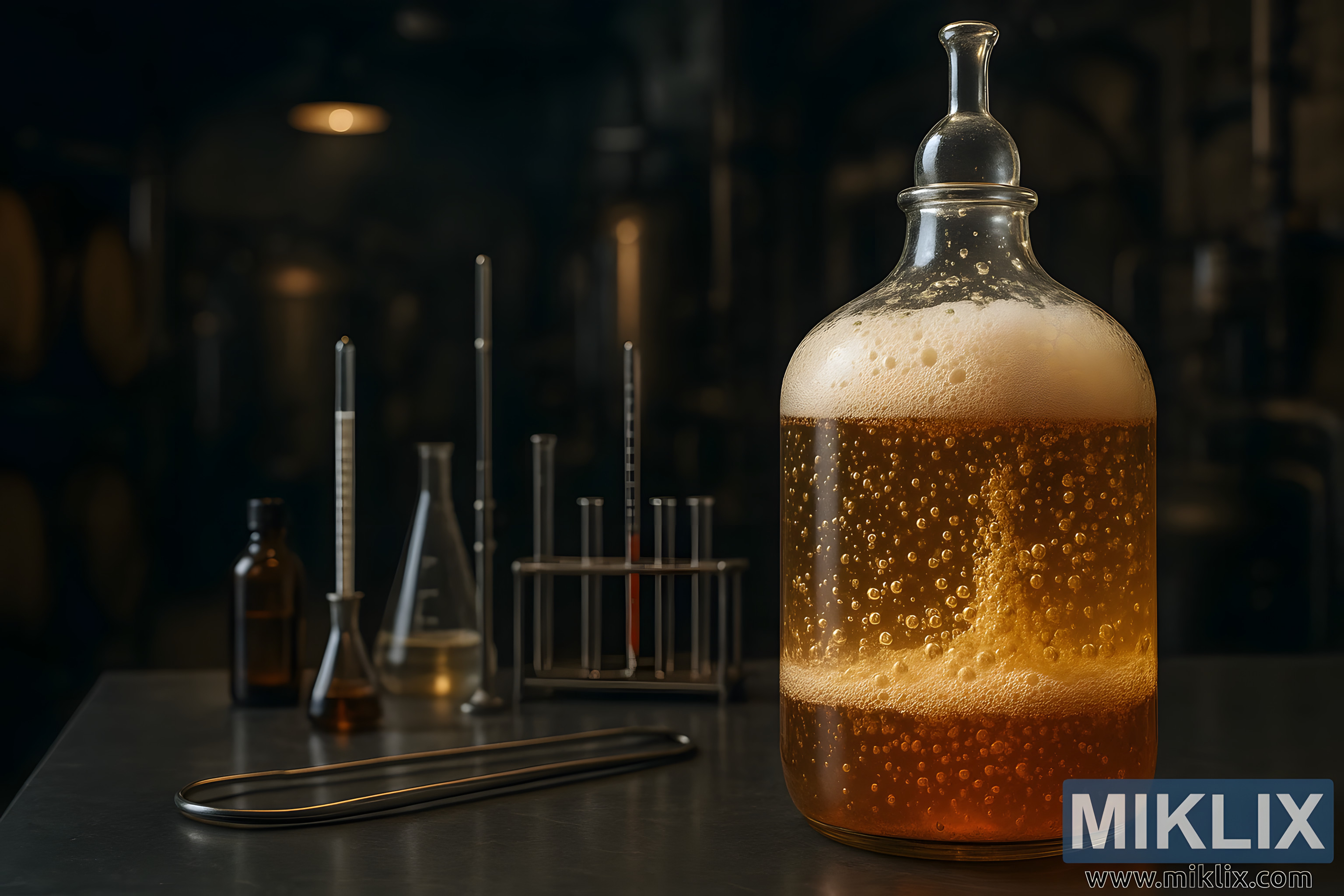 Laboratorijska scena sa staklenom posudom aktivnog lager kvasca, mjehurići koji se dižu, okružena instrumentima za kuhanje u tmurnom okruženju pivovare.