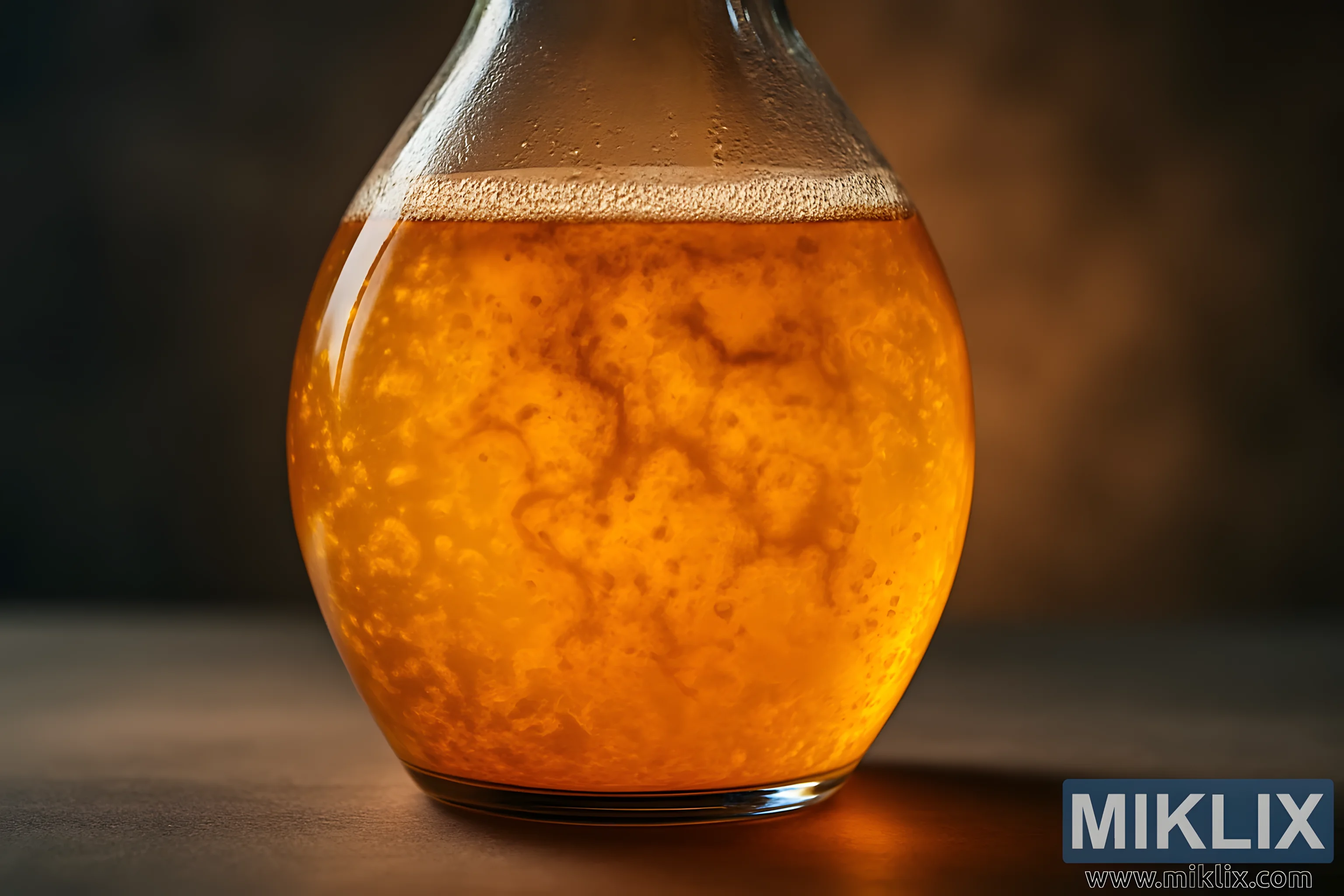 Svjetlucava staklena posuda ispunjena mutnom zlatnom tekućinom i vrtložnim česticama kvasca, toplo svijetleći na mekoj tamnoj pozadini.