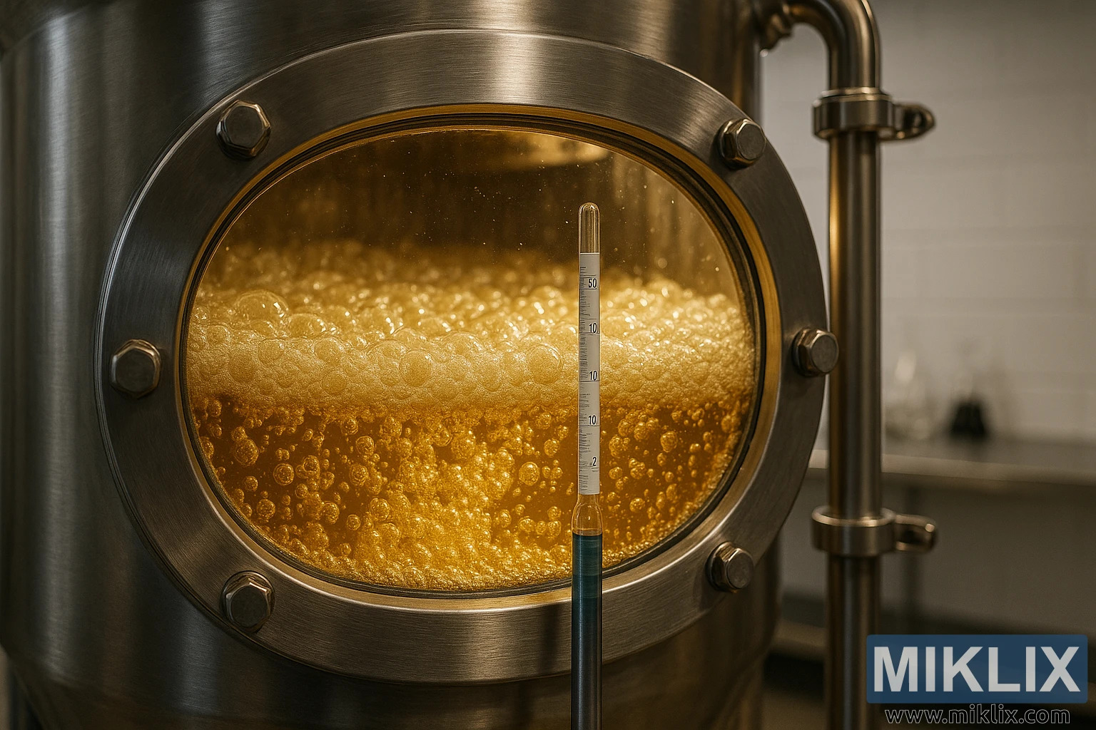 Detaljan prikaz fermentacijskog spremnika od nehrđajućeg čelika s mjehurićima piva, očitanjima hidrometra i toplim osvjetljenjem u preciznom laboratorijskom okruženju.