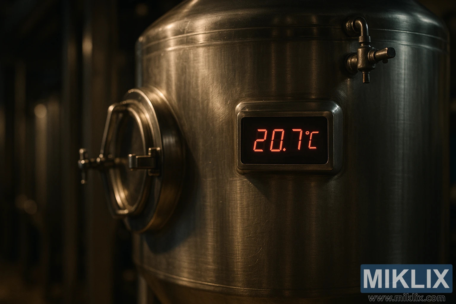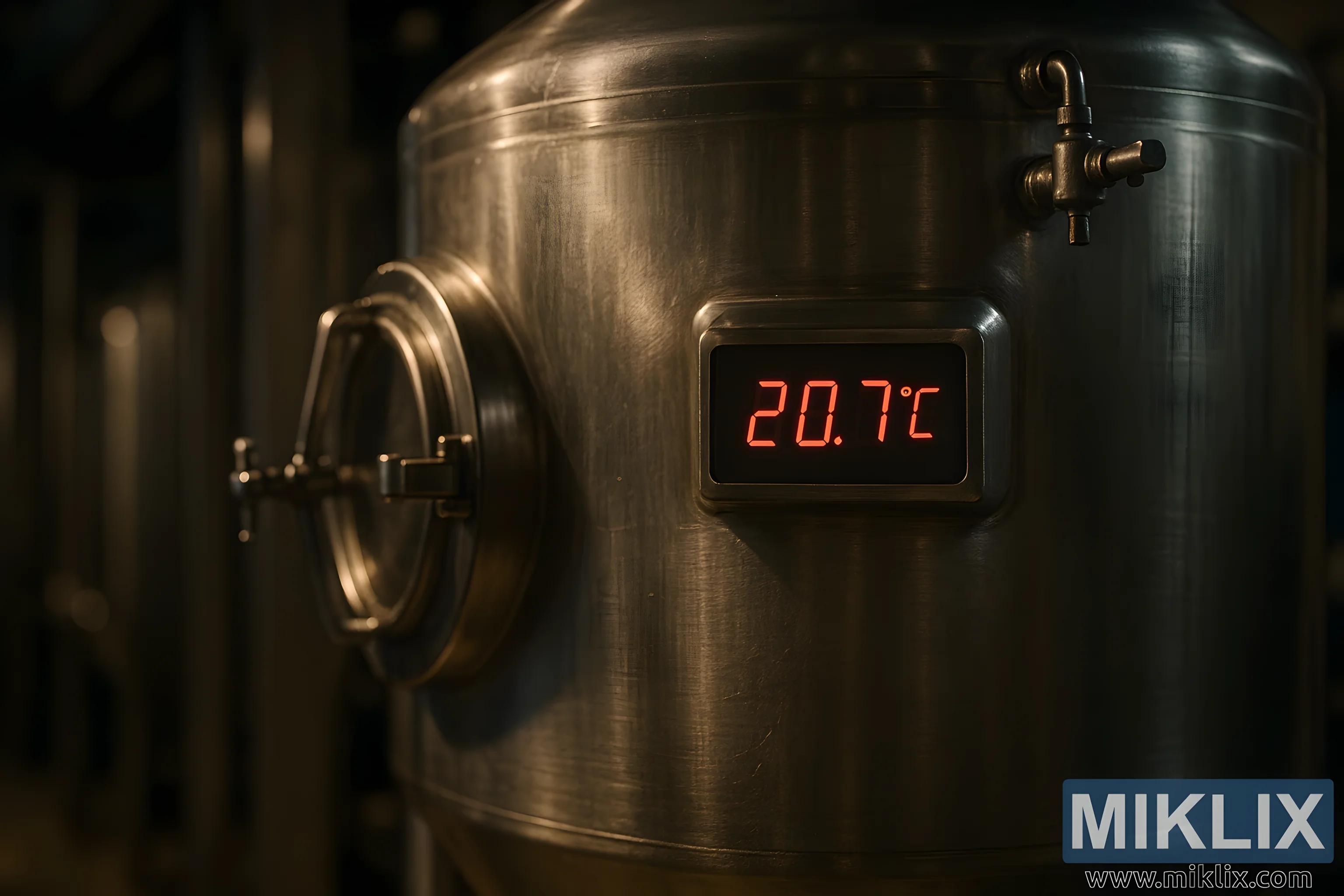 Polirani spremnik za fermentaciju od nehrđajućeg čelika u slabo osvijetljenoj pivovari, s naglaskom na preciznu kontrolu temperature za optimalnu fermentaciju piva.