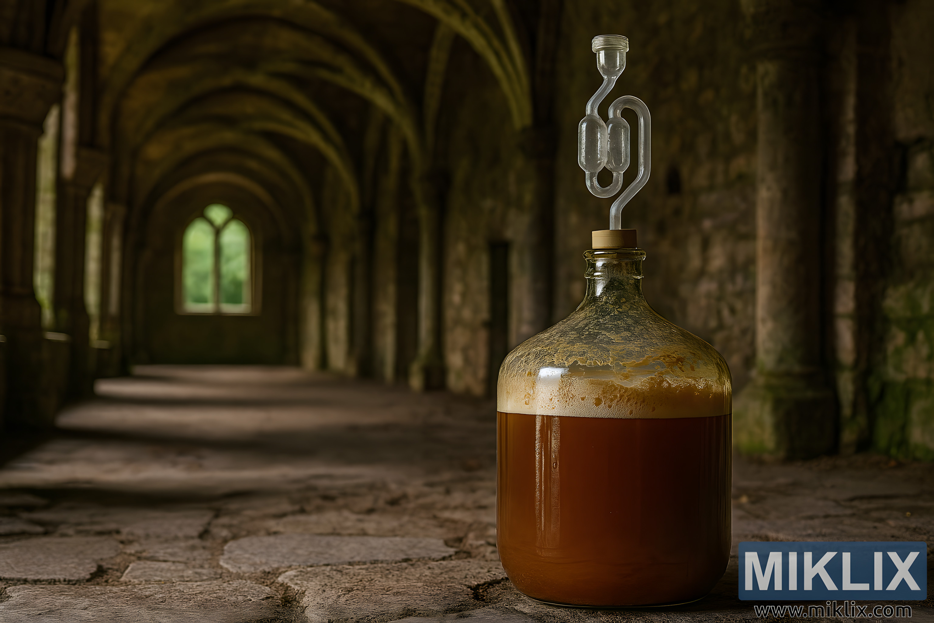 Fotografija pejzaža visoke rezolucije prikazuje stakleni balon belgijskog jakog piva koji aktivno fermentira unutar tradicionalne rustikalne belgijske opatije. Balon se nalazi u desnom prednjem planu, njegovo zaobljeno, blago lukovičasto tijelo sužava se u kratki vrat zatvoren bež gumenim čepom. Staklena zračna komora u obliku slova S čisto se uzdiže iz čepa, a unutar njezinih dvostrukih petlji vidljiva je mala količina bistre tekućine, osiguravajući jednosmjerno ispuštanje ugljičnog dioksida, a istovremeno štiti sladovinu od vanjskog zraka. Samo pivo je tamno jantarne boje, lomi tople tonove koji se kreću od medeno-zlatne boje blizu rubova do bakrene i polirane kestenjaste u sredini. Na vrhu, debeli sloj prljavobijele do blijedosmeđe pjene kruni površinu, prianjajući uz unutarnje staklo s neravnomjernim čipkom i ostavljajući slab, prugasti ostatak koji govori o nedavnoj snažnoj aktivnosti.